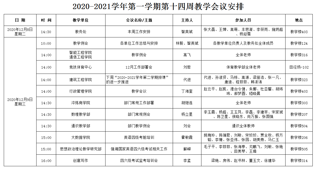 2020-2021学年第一学期第十四周教学会议安排