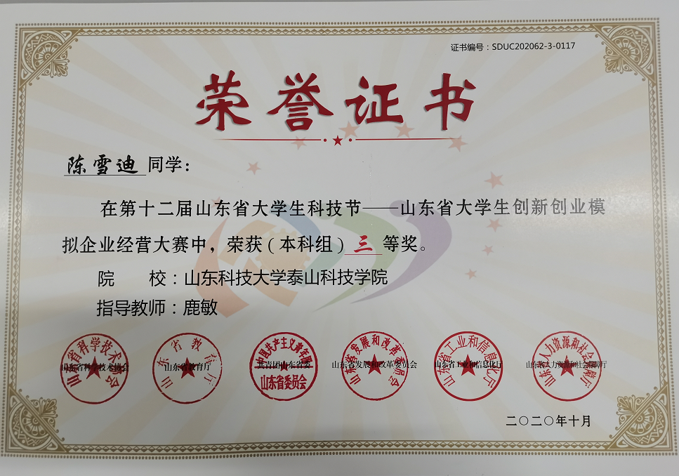 经过激烈角逐,泰山科技学院的淬炼商学院会计学(本)19-1班的刘浩东、王瑞、崔晓梦、刘孟帆、陈雪迪五位同学取得好成绩,荣获本科组三等奖。