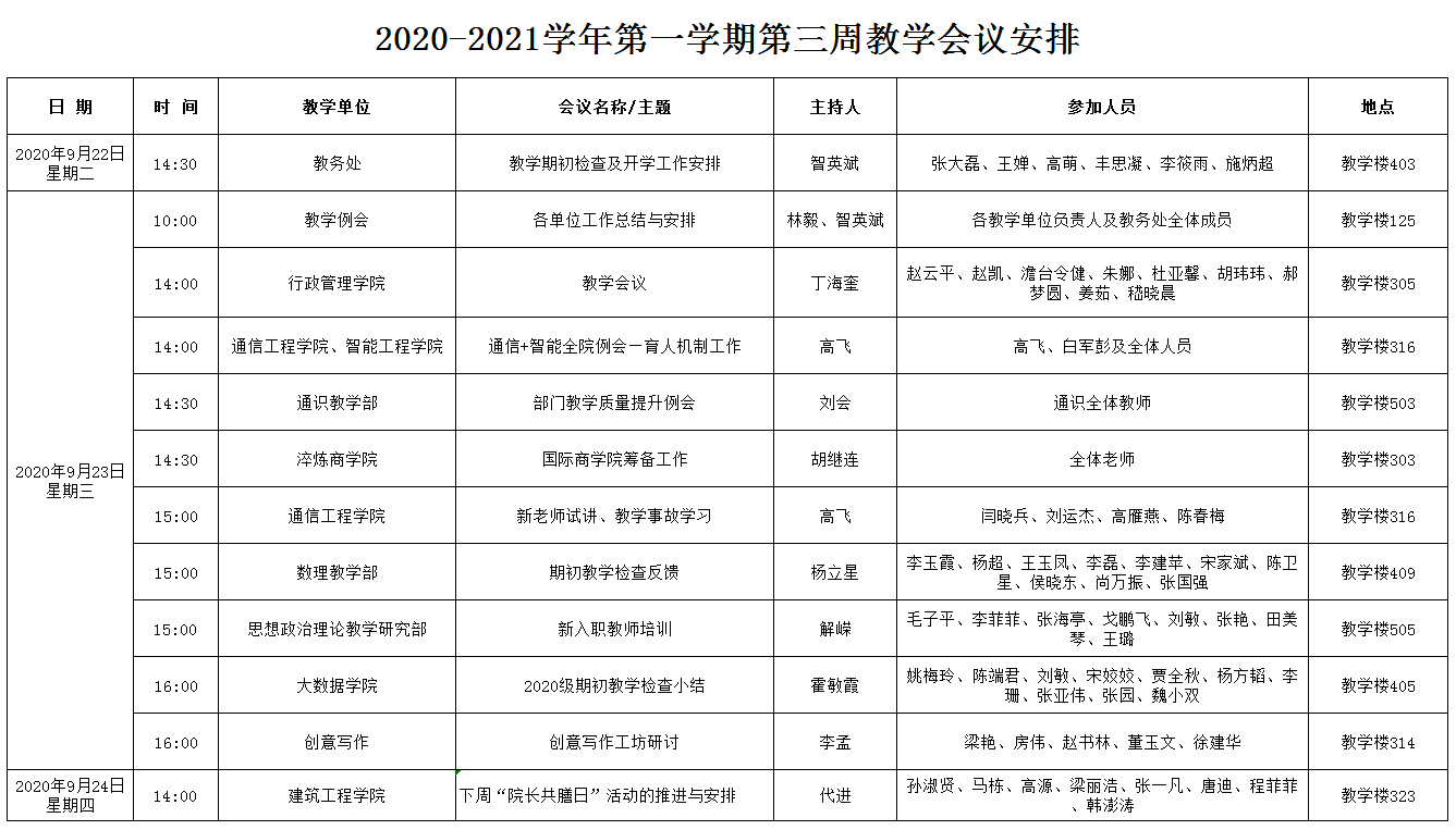 2020-2021学年第一学期第三周教学会议安排