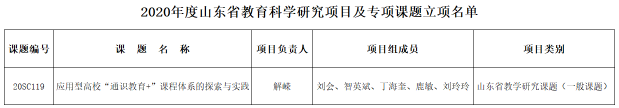 近日,山东省青少年教育科学研究院发布《关于公布2020年度山东省教育科学研究项目及专项课题立项的通知》,经专家评审,我院解嵘主持的《应用型高校“通识教育+”课程体系的探索与实践》被确定为一般项目。