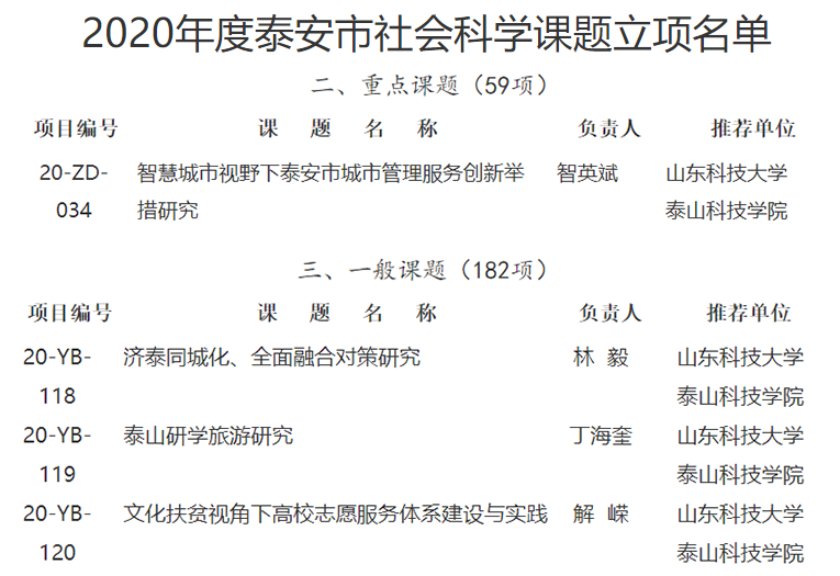 近日,泰安市社科联发布《关于公布2020年度泰安市社会科学课题立项名单的通知》,经社科专家评审,市社科联研究审批,我校共有4项课题获准立项,其中重点项目1项,一般项目3项。智英斌主持的《智慧城市视野下泰安市城市管理服务创新举措研究》被确定为重点项目,林毅主持的《济泰同城化、全面融合对策研究》、丁海奎主持的《泰山研学旅游研究》、解嵘主持的《文化扶贫视角下高校志愿服务体系建设与实践》被确定为一般项目。