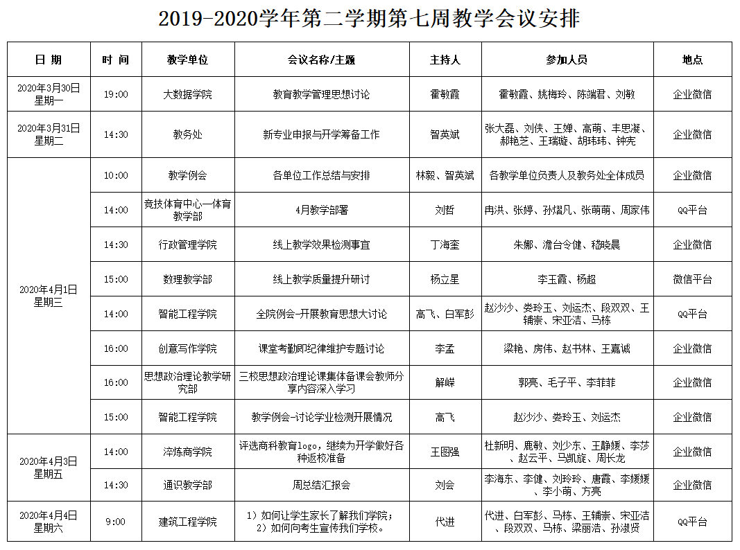 2019-2020学年第二学期第七周教学会议安排