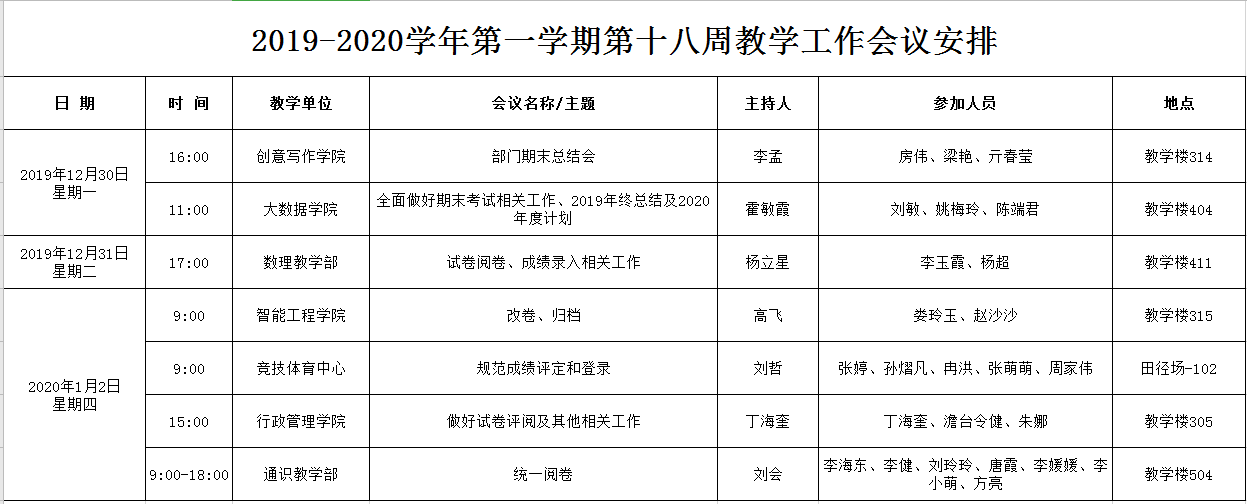 2019-2020学年第一学期第十八周教学工作会议安排