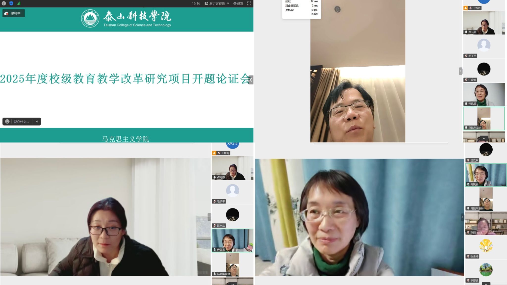 为深入贯彻落实学校“教育教学三提三创”主题年活动内涵提级要求,积极响应泰山科技学院2025年度校级教育教学改革研究项目开题论证工作部署,进一步规范课题研究流程、明晰研究方向、提升研究质量,11月4日晚,马克思主义学院组织召开2025年度校级教育教学改革研究项目开题论证会。会议邀请青岛理工大学华章琳教授、泰山学院亓凤香教授及卢元芬教授担任论证专家,学院院长助理张丽主持会议。