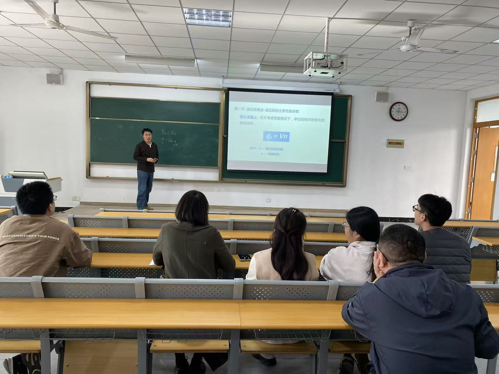 课堂上,王伟老师以液压泵的工作原理为主线,结合动画展示,系统讲解了液压泵的分类、结构特点、性能参数及其在液压系统中的核心作用。他通过生动的语言和清晰的板书,揭示“容积式液压泵”的工作机制,深入浅出地阐述了排量、流量、压力、功率与效率等关键概念,并通过公式推导和实例分析,强化对液压泵能量转换过程的理解。