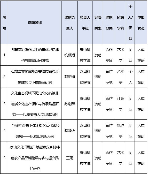 此次立项课题聚焦中华优秀传统文化的创造性转化与创新性发展,涵盖艺术学、社会学、管理学等多个学科,研究内容紧密结合泰安本土文化资源与区域发展需求,是学院专业建设主动服务地方文化经济建设的重要体现,也是深入践行学校“教育教学三提三创”主题年活动的扎实举措。