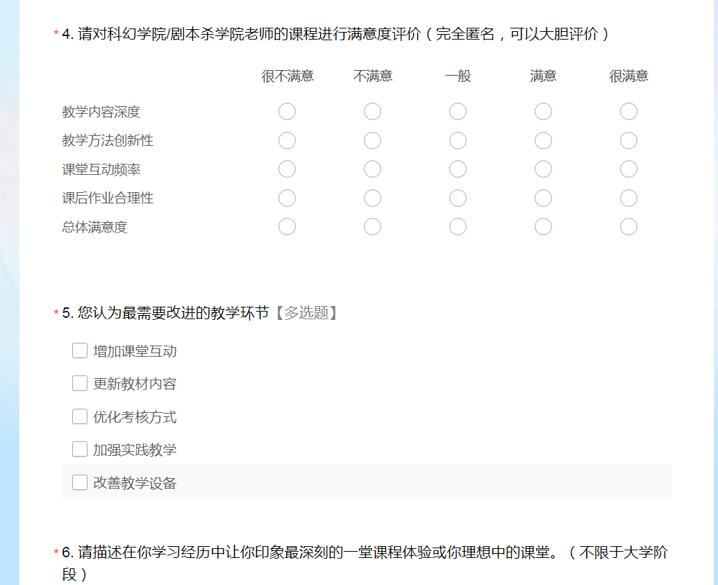 同学们提出多项建设性意见,包括更新课程案例、扩大热门选修课教室容量、延长剧本杀实践课时等,以进一步提升学习体验。