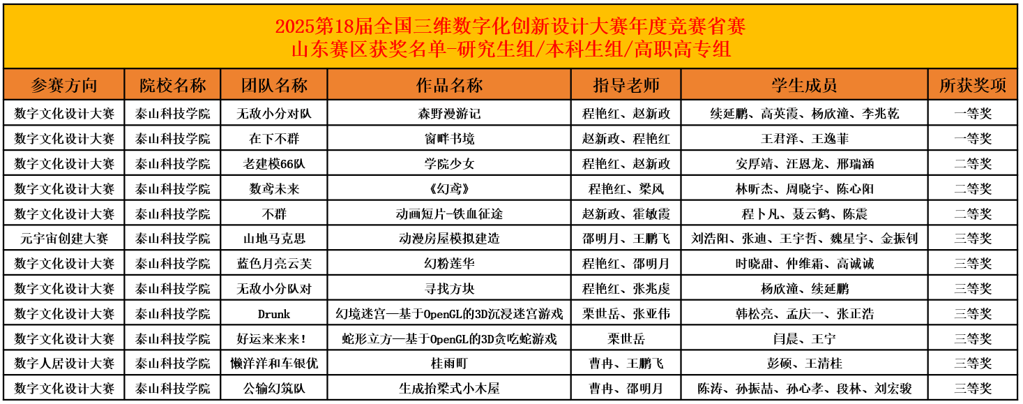为全面落实立德树人根本任务,深入推进素质教育改革,切实提升学生的创新实践能力,我校积极组织学生参加学科竞赛,持续推进学校“教育教学三提三创”主题年活动。第18届全国三维数字化创新设计大赛山东赛区赛事于2025年11月1日圆满落幕。该赛事由3D动力发起举办,并先后得到科技部、工信部、教育部、中国科协等部门指导。近日省赛获奖结果正式揭晓,我校大数据学院学子凭借扎实的专业能力与创新设计脱颖而出,共斩获省级一等奖2项、二等奖3项、三等奖7项,实现了我院在该项赛事中奖项和数量的历史性突破,展现了强劲的综合实力。