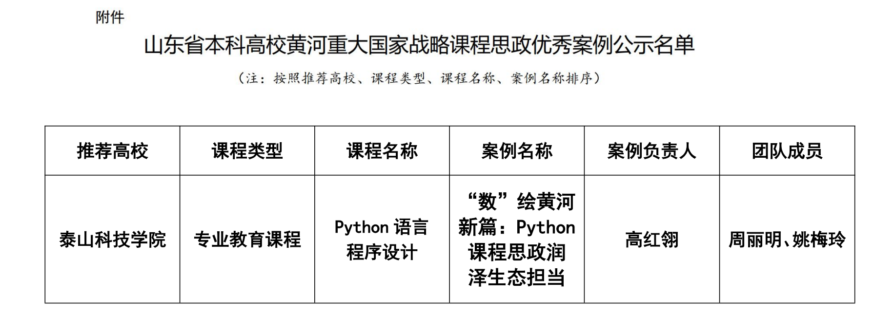 为深入贯彻落实学校“教育教学三提三创”主题年活动部署,持续推进教学改革与创新,近日,山东省高等学校课程思政研究中心公布了2025年山东省本科高校黄河重大国家战略课程思政优秀案例评选结果,我校大数据学院申报的案例《“数“绘黄河新篇:Python课程思政润泽生态担当》成功入选,充分体现了学校在课程思政融合创新与教育教学内涵提升方面的扎实成效。