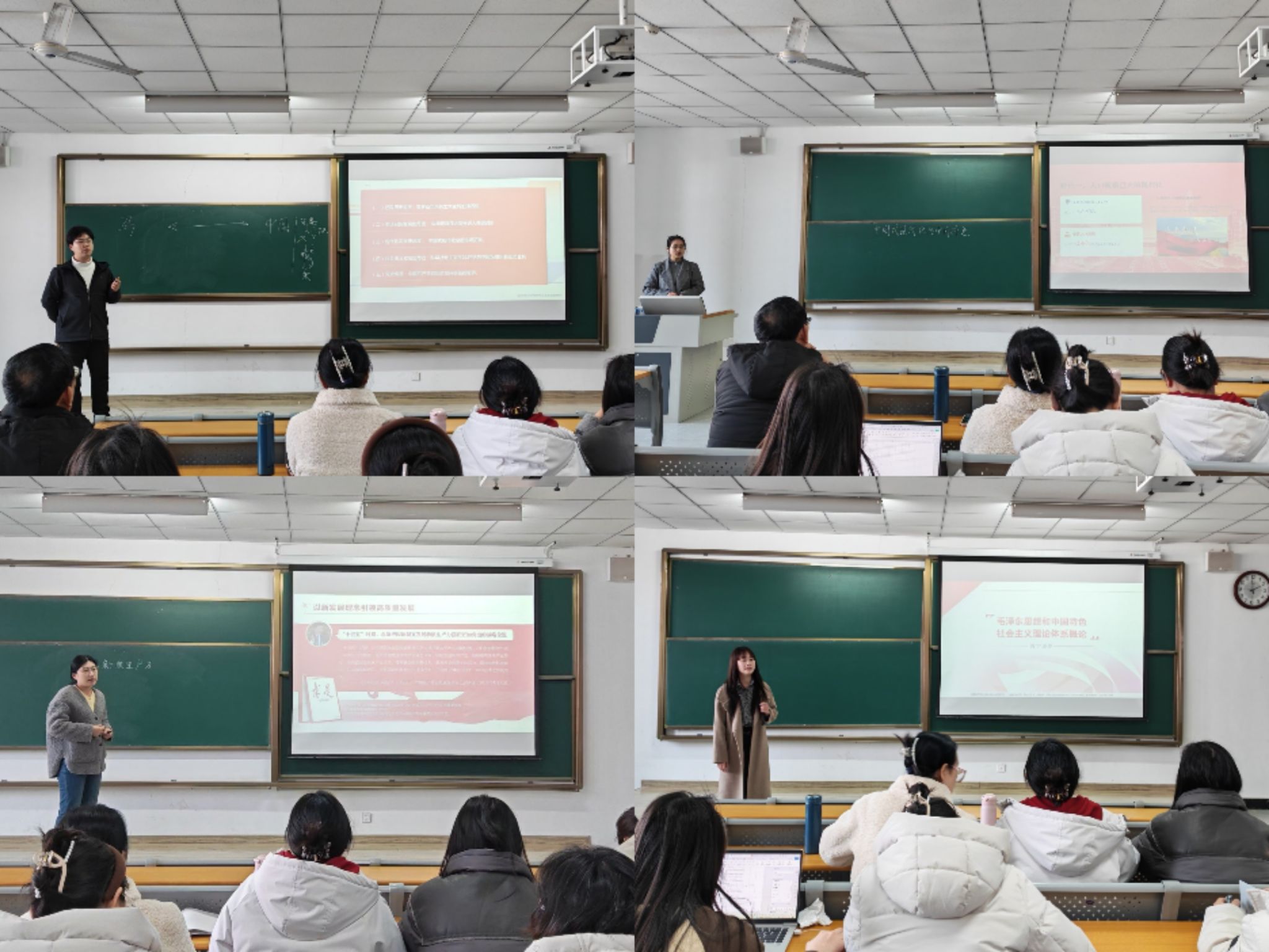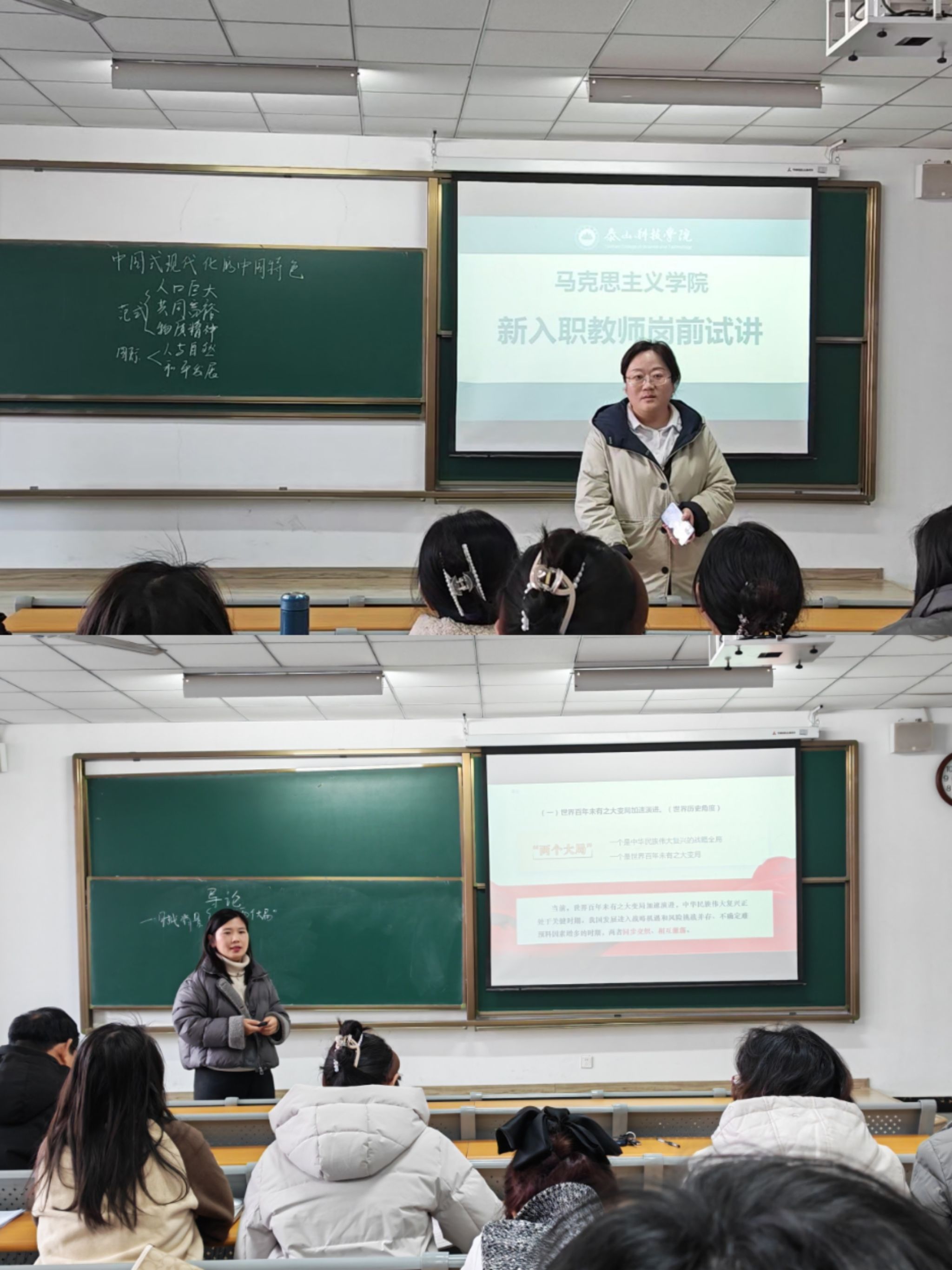 王金、刘宇瑾等四位新入职教师围绕两门核心思政课程重点内容展开试讲。试讲中,他们紧扣立德树人根本任务,融合理论与案例,逻辑清晰、教态自然,展现出良好的专业素养与精神风貌。