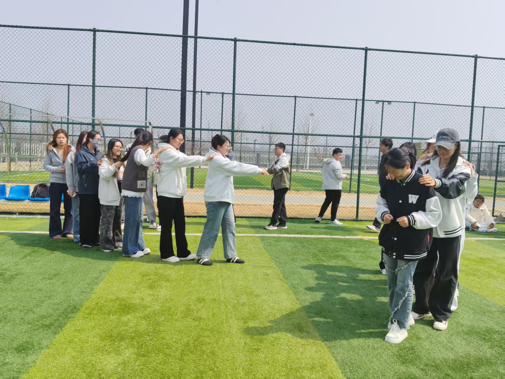 第二个项目“渔网猎鱼”将活动推向高潮。起初两名同学手拉手组成“渔网”,其余同学化身“鱼儿”在区域内奔跑躲避。渔网必须全程拉手不松开,随着一条条“鱼儿”被捕获,渔网越来越庞大,抓捕难度也逐渐增加。鱼儿们左躲右闪,渔网则紧密配合步步紧逼,整个过程笑声不断,同学们在奔跑中释放了压力,也在配合中增进了默契。