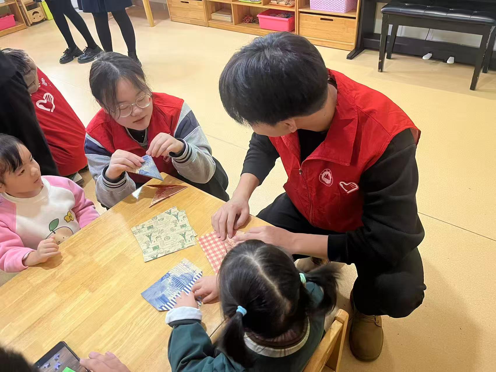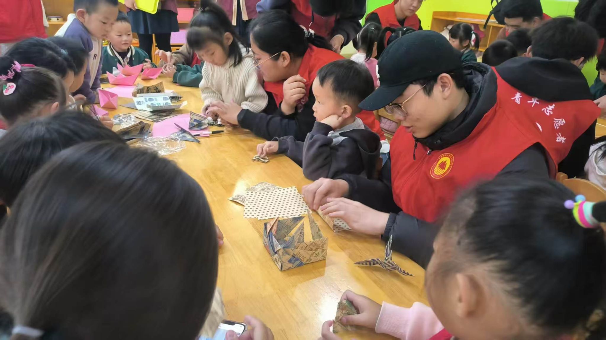 活动开始,进入“创意折纸工坊”活动,大学生志愿者身着志愿服,友善地与小朋友互动,教导小朋友折纸,他们一边示范如何折纸,一边耐心教导和鼓励小朋友的动手能力。