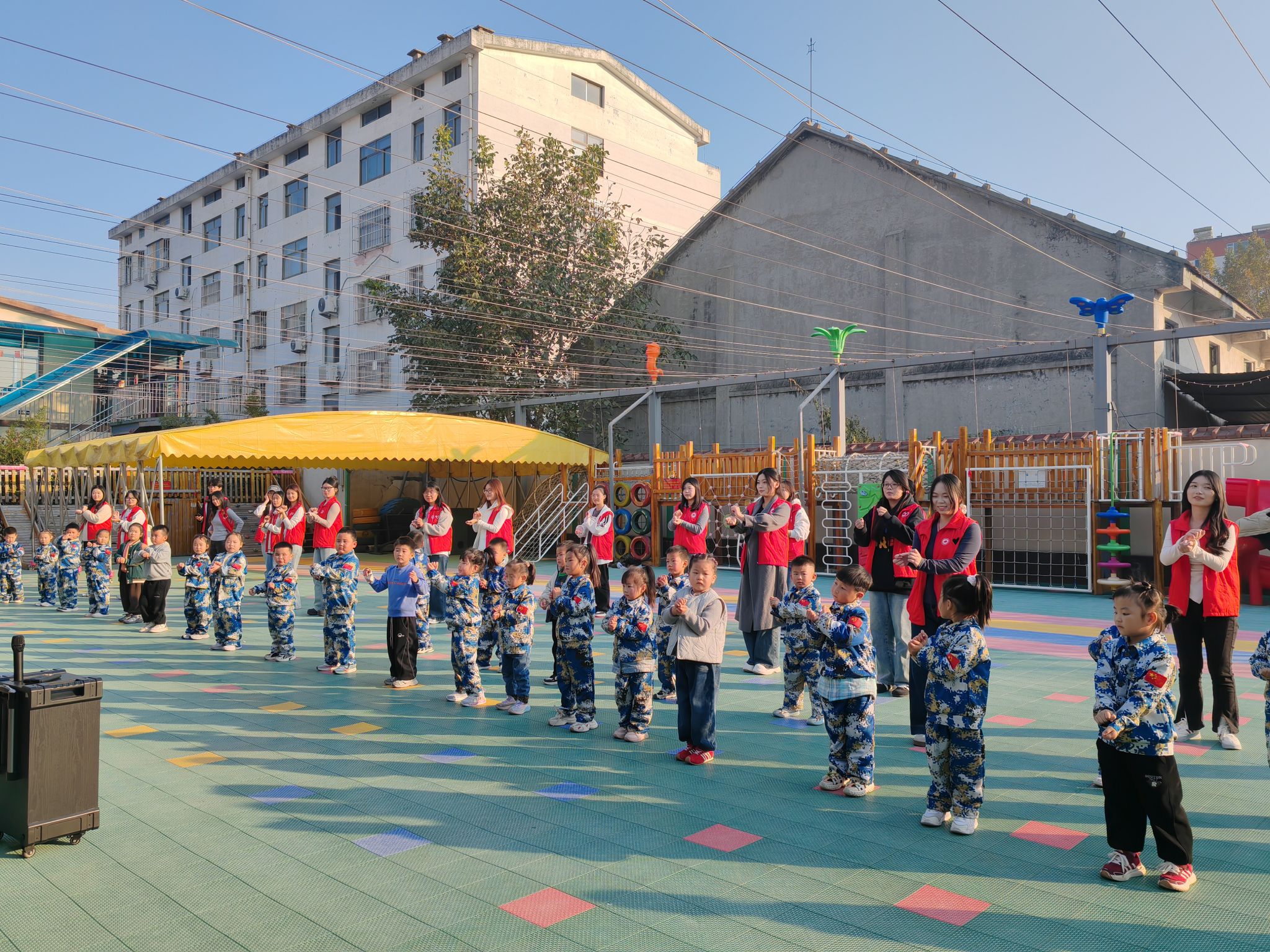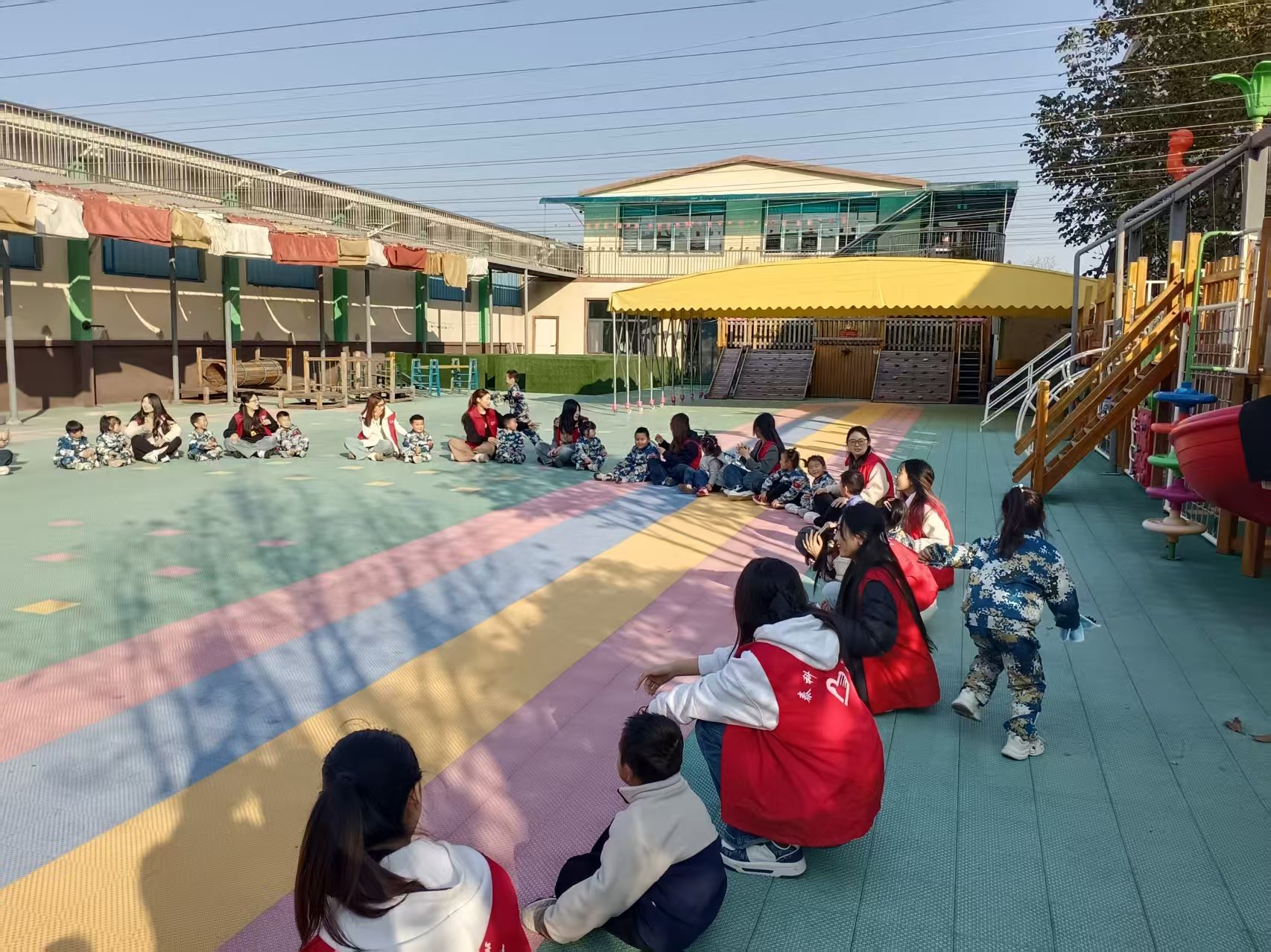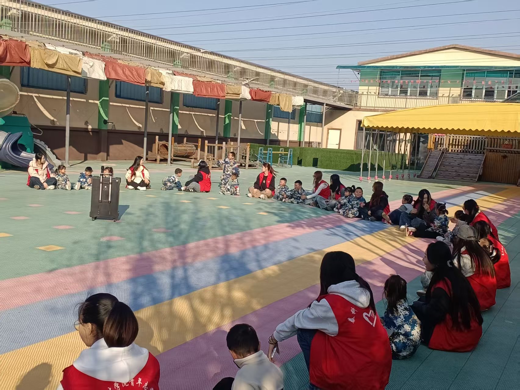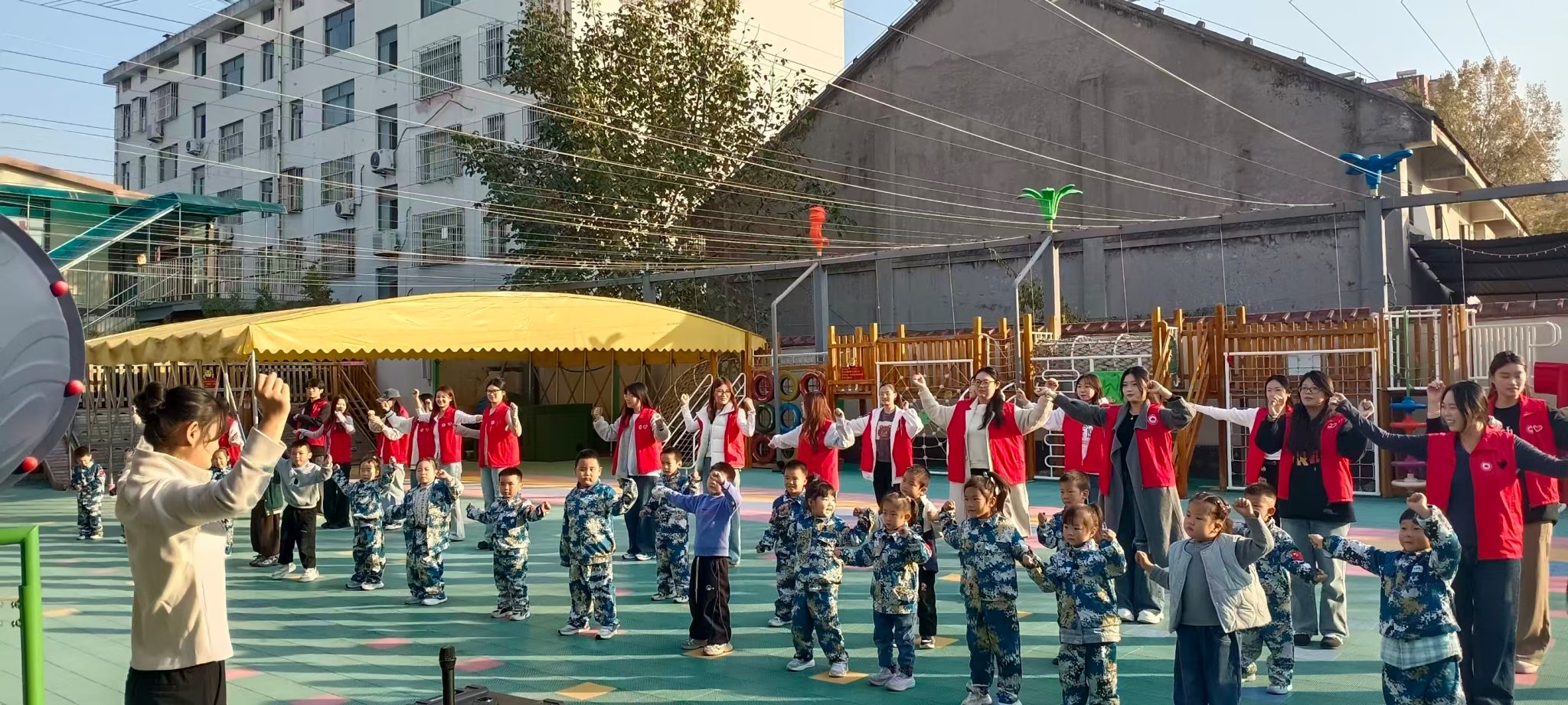 在幼儿园的户外活动场地,志愿者们率先组织开展 “丢手绢” 游戏,他们和孩子们围坐成一个大圆圈,伴随着欢快的儿歌节奏,一名志愿者手持手绢轻轻绕圈奔跑,孩子们则紧张又兴奋地盯着手绢,生怕它落在自己身后。当手绢被悄悄放下,孩子们立刻起身追赶,现场笑声、欢呼声此起彼伏,纯真的快乐感染了在场的每一个人。