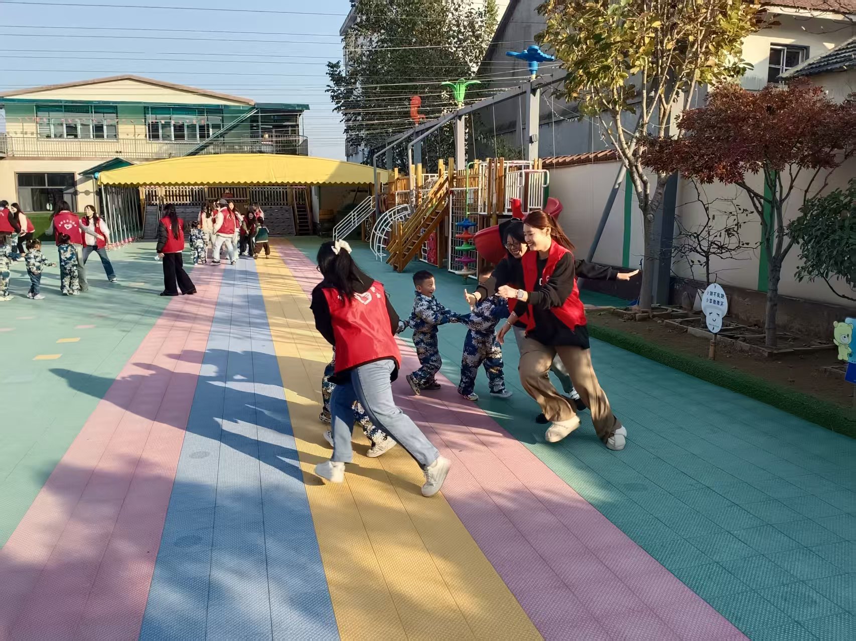 “老鹰来啦!” 随着一声清脆的呼喊,“老鹰抓小鸡” 游戏正式拉开帷幕。志愿者们分工明确,有的扮演 “老鹰”,灵活地穿梭在 “鸡群” 中寻找目标;有的扮演 “鸡妈妈”,张开双臂奋力保护身后的 “小鸡”;孩子们则紧紧跟在 “鸡妈妈” 身后,时而躲闪、时而奔跑,小小的身影在阳光下灵动穿梭。期间,志愿者们始终保持耐心,时刻关注孩子们的安全,及时调整游戏节奏,确保每个孩子都能参与其中、感受快乐。一位扎着羊角辫的小朋友拉着志愿者的手说:“大哥哥大姐姐陪我们玩游戏,我今天特别开心!”