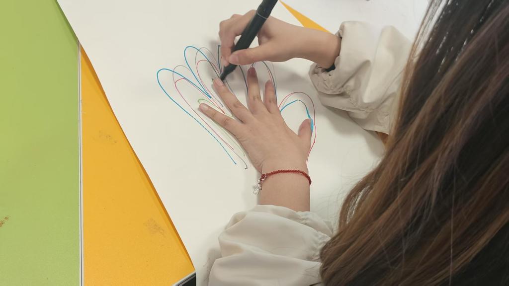活动现场,同学们以手掌为画布,通过色彩选择与文字书写开启自我对话。有人用深蓝色水彩勾勒焦虑的波纹,又在指尖点缀象征希望的明黄;有人在掌心写下“停止内耗”,随后用荧光笔重重圈画;更有参与者将考研目标拆解成阶梯状符号,让抽象的理想化作触手可及的成长路径。“当压力变成具象图案,突然发现它并没有想象中可怕。”活动现场的参加者林嘉鑫展示着画满星辰的手掌,表示创作过程像“给情绪做了次可视化体检”。