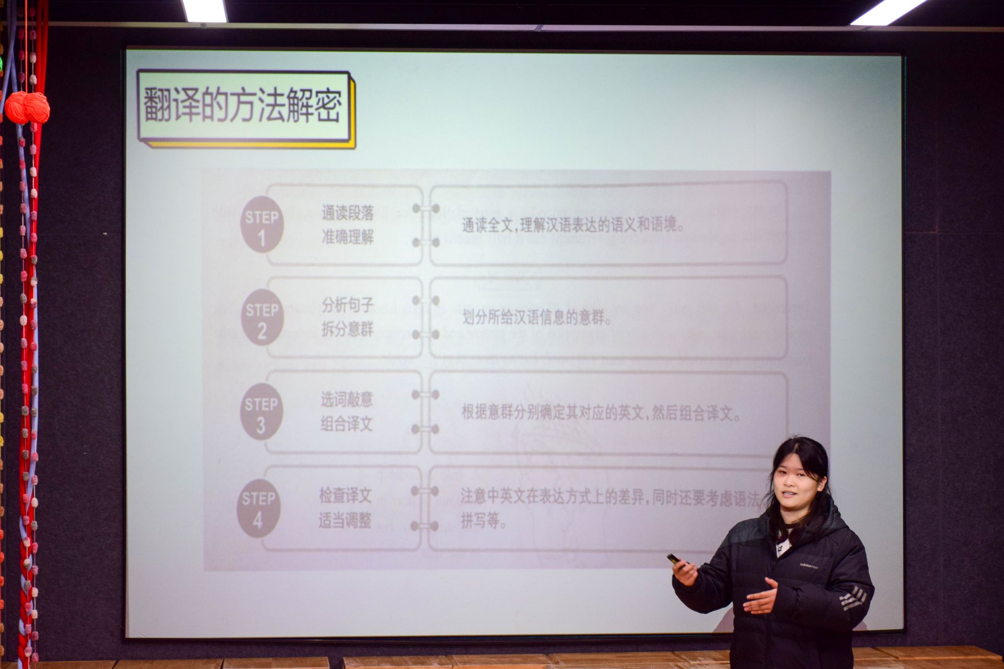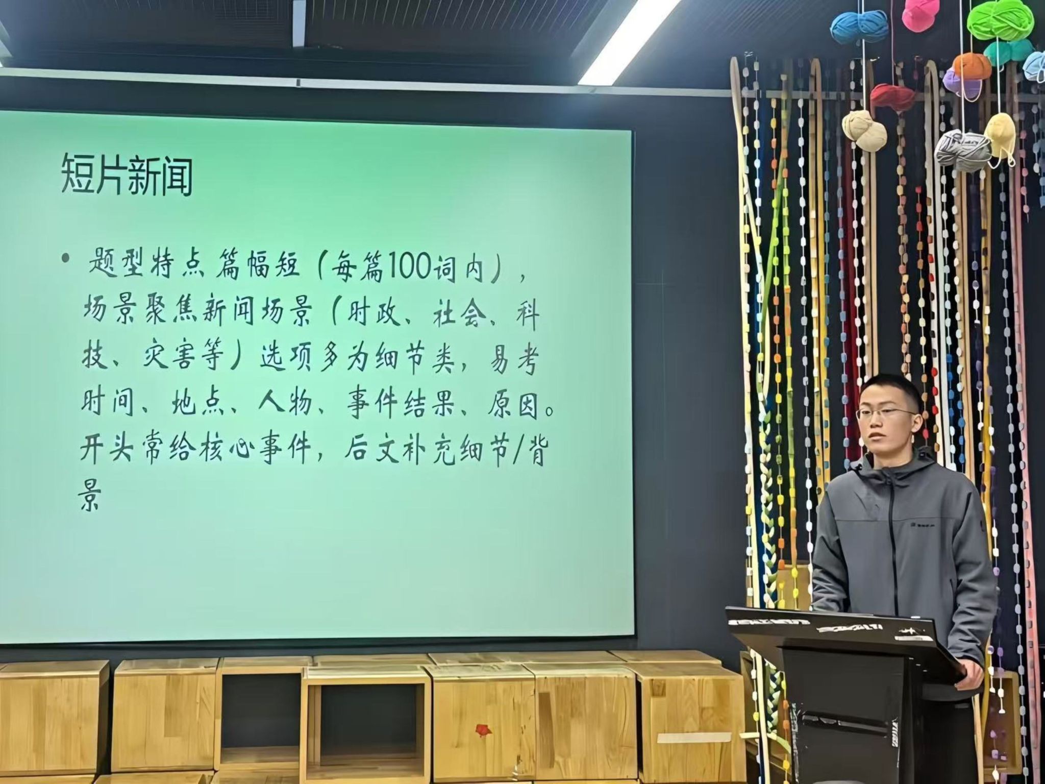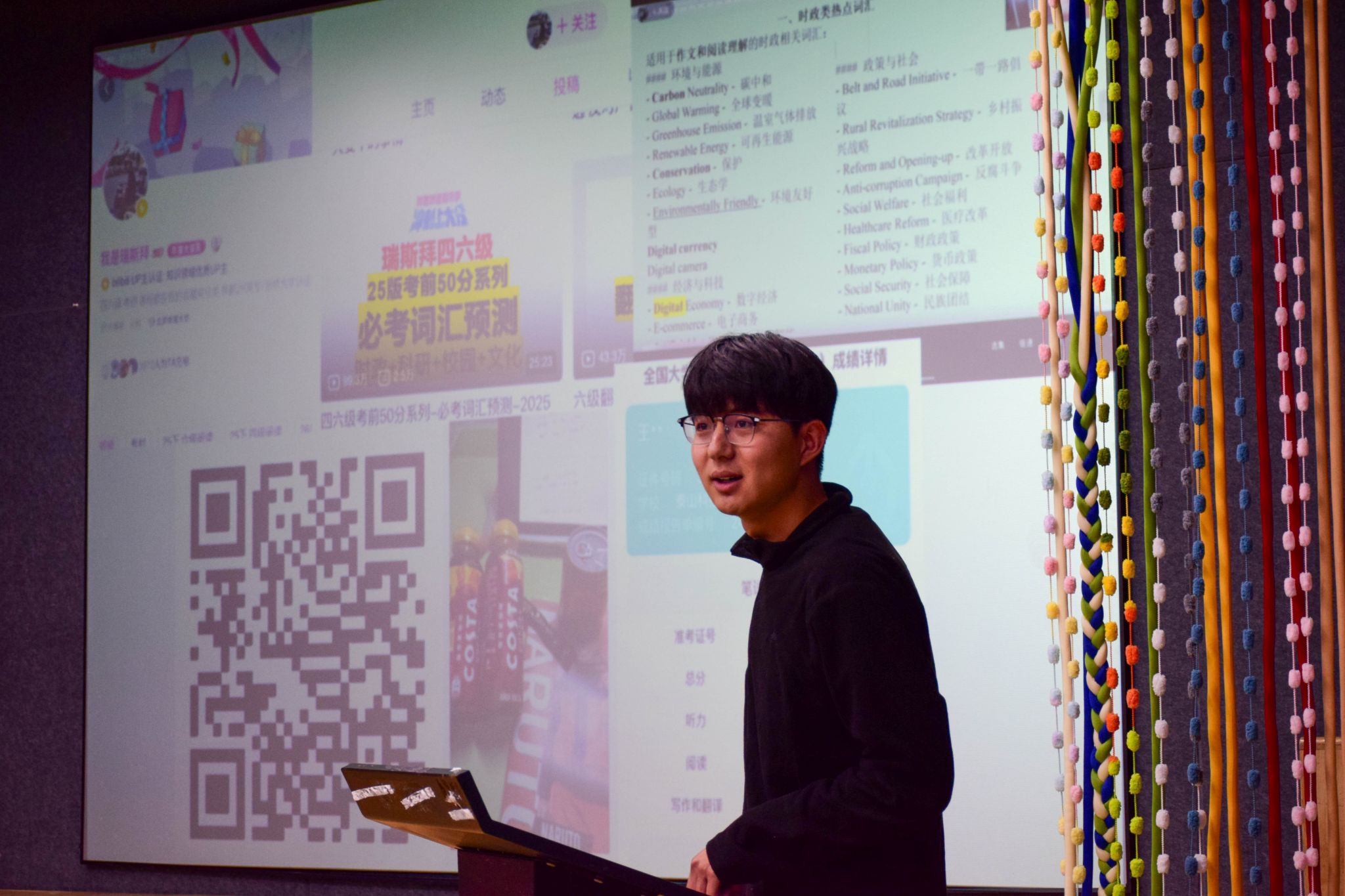 沉稳靠谱的王春龙学长率先登场,一上来就戳中大家“单词背完就忘”的痛点,分享了找单词共性、结合专业内容的实用记忆法,还搭配了科学复习计划表和贴合专业的句子,强调每天20分钟碎片化时间就能记牢单词;紧接着活泼外向的刘政屿学长接棒,化身“气氛担当”,用“拆机器”“解代码”的生动比喻,一边夸张模仿一边手舞足蹈,把阅读理解中长难句“抓核心、拆分支”的技巧讲得明明白白。随后自带“佛系学霸”气场的刘若涵学姐聚焦翻译提分,建议大家别死磕高级词汇,不如把自己有把握的单词写出来,将句子完整的意思翻译出来;最后风风火火的张智杨学长压轴带来听力“冲刺大招”,明确短片新闻的备考重点,反复强调新闻开头的重要性,还特意提醒大家开头一定要抓住主旨,四人风格鲜明、各有侧重,干货满满又衔接顺畅。