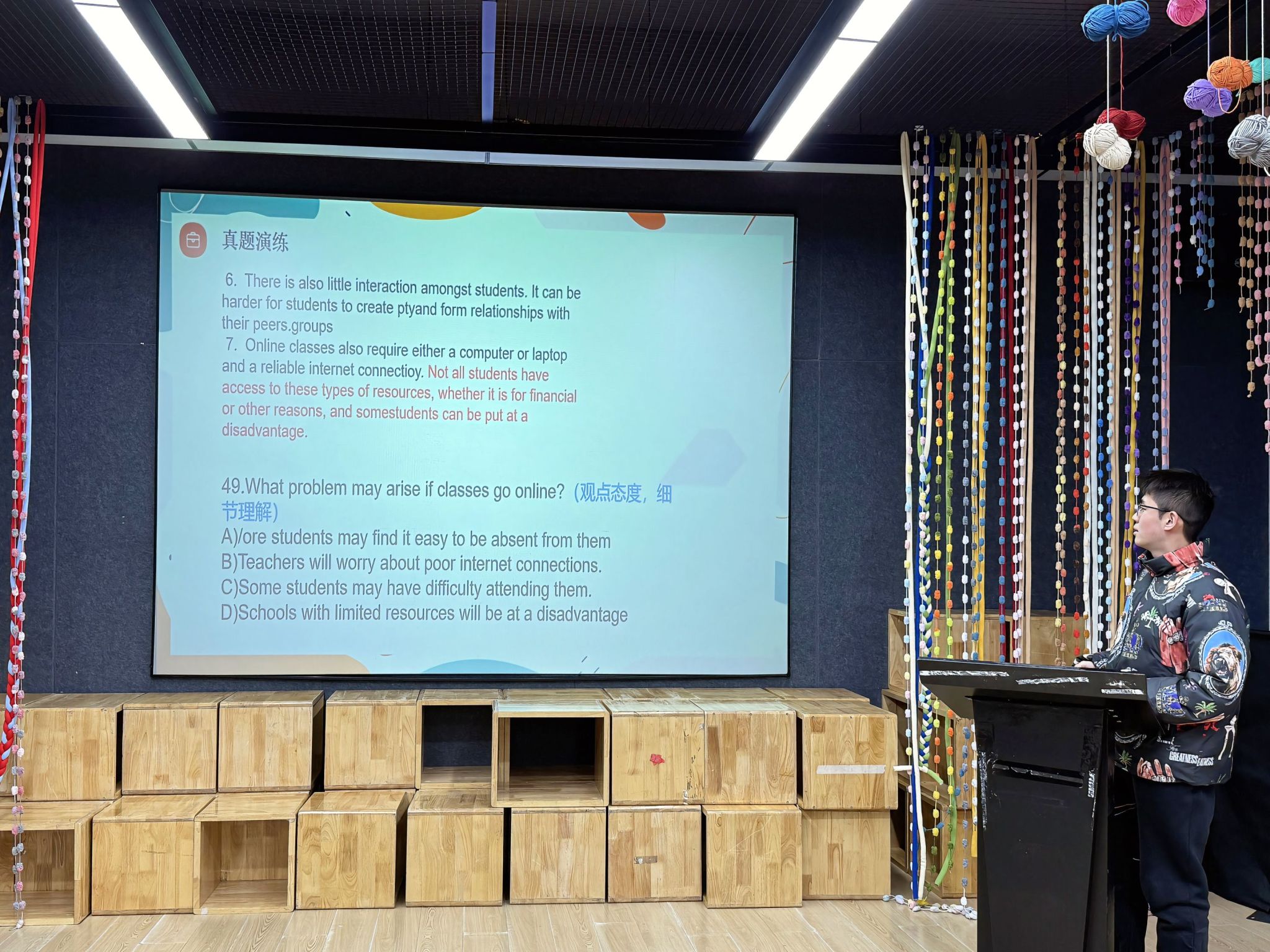 四位学长的分享刚落幕,台下同学立刻开启“提问模式”,举手的身影此起彼伏,满是迫切求解的热情。“学长,我做阅读总在细节题上出错,该怎么解决啊?”一位同学急切发问,眼神里满是焦虑。刘政屿学长推了推眼镜,耐心回应:“细节题关键在于定位原文后,进行同义替换,找到题干关键词后,返回原文锁定对应句子,答案往往藏在同义表达里,千万别凭主观感觉答题!”。