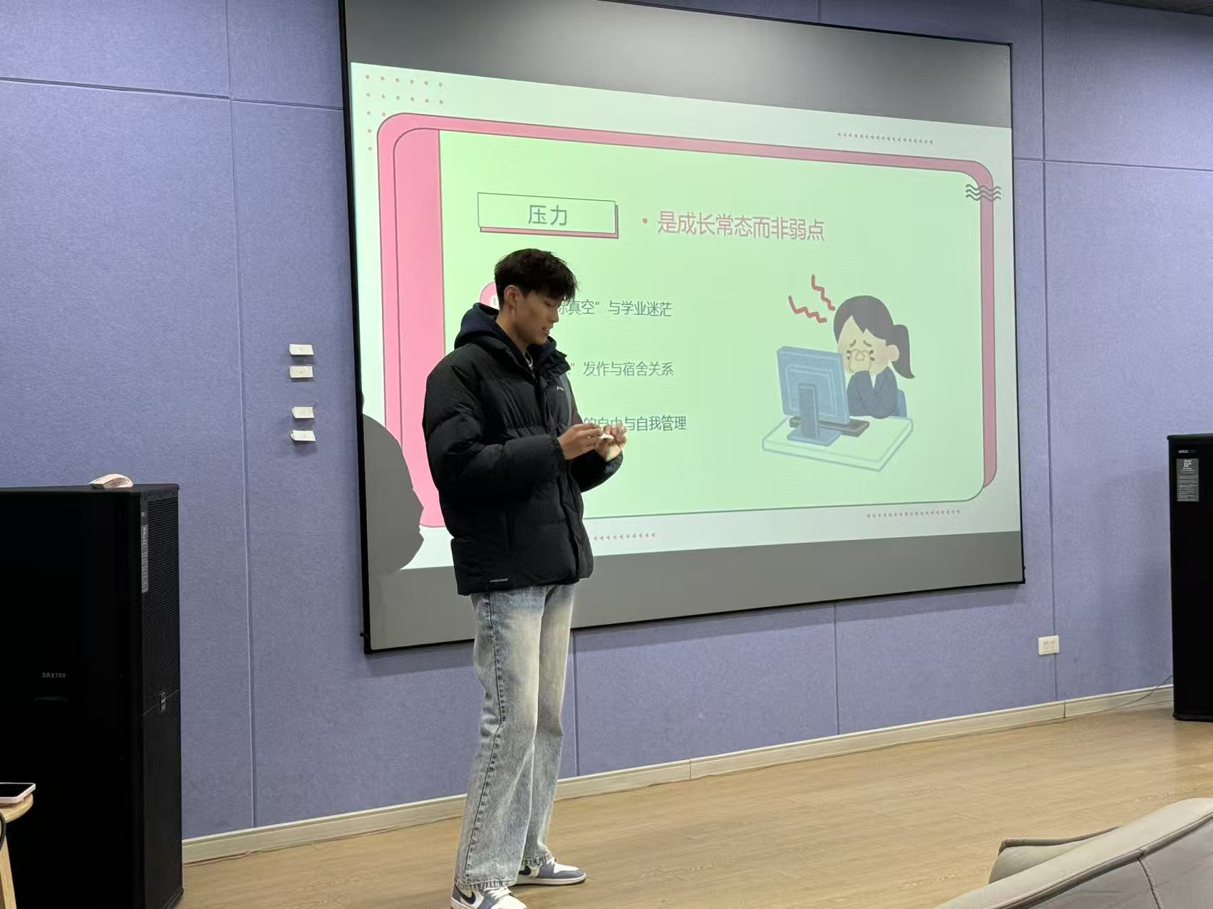 活动伊始,抽取冬日能量卡环节迅速点燃现场氛围。一张张写满暖心寄语与治愈小贴士的能量卡,让同学们在随机抽取的惊喜中收获专属鼓励,瞬间驱散了冬日的寒意。随后,三位同学主动走上台前分享解压妙招,有人推荐沉浸式阅读与运动流汗的宣泄方式,有人分享与好友倾诉、记录手账的治愈技巧,真诚的分享引发全场共鸣,也为大家提供了多元的解压思路。