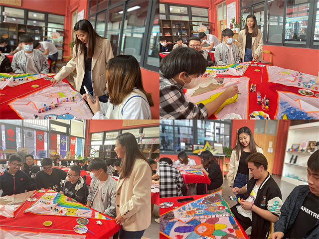 本次活动,由刘倩倩老师讲解了风筝的小知识、认识风筝的制作材料、方法和过程,欣赏形状各异、图案纷呈的风筝。开始手绘风筝,同学们趴在画布上,调色、构形、填色、创作,忘情地勾勒着自己想要的图案,最后装上骨架、系上放飞线,一个个充满着无限有趣和艺术特色的风筝作品就完成了。每一个作品都是他们的骄傲,他们围在一起,互相展示着、分享着。大量精致的风筝从我校学生灵巧的双手中诞生。