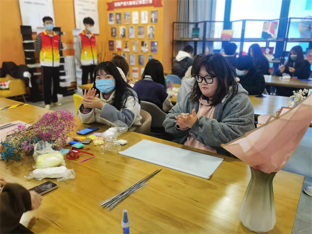 最美不过三月天,花开成海,春意盎然。为了弘扬民族优秀文化,促进校园生活,提高学生们的审美素质,激发学生们创新思维。由建筑工程学院、艺术传媒学院团总支·学生会社团服务部于2022年3月25日在东岳书院120举办了“巧手生花”永生花花束制作活动。制作花束是一门具有浓郁生活气息的高雅艺术活动,不仅能丰富学生的日常生活,美化环境,更能提升动手能力。活动现场,一支支美丽的花束及黏土制作工具铺在桌面上,让大家瞬间拥有美丽心情。