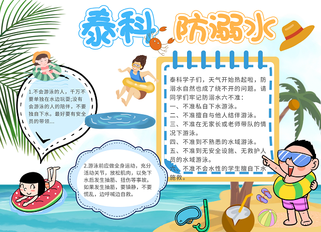 社团服务部的海报以黄色的沙滩为背景,可爱的小人物向同学们叙述并总结防溺水小知识,告诫大家注意安全,话语中透出的不仅是告诫的严厉还有的是暖暖的关心。