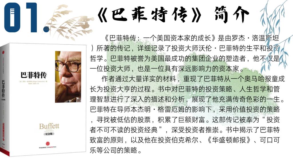 首先,我被巴菲特对价值投资的执着追求所深深打动。他坚信,投资的本质在于寻找并持有那些被市场低估的优质企业,而非盲目追逐市场热点或短期利润。这种长期主义的投资理念,让我意识到,在纷扰复杂的市场中保持清醒的头脑和坚定的信念是多么重要。它教会我,在投资乃至人生的道路上,要有耐心,有远见,不为眼前的利益所迷惑,始终坚守自己的原则和信念才能走向成功。