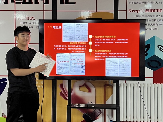 在线下评选的现场,参加者们依次上台展示自己的笔记并且讲述了自己对于笔记的理解,其中耿睿彬同学为同学们分享了他做笔记的意义:“记笔记是一种深度学习和知识内化的重要方式。它不仅仅是对课堂内容的简单复制,更是一种思维的梳理和知识的重构。”而陈洪涛同学则讲述了他做笔记的细节,他是如何记笔记;如何整理笔记;对笔记重要性的认知。他其中说到一点“记笔记不单单只是把知识记到纸上,它更是一种学习的重要手段,但是记笔记也不是学习手段中最重要的,阅读,理解和提出想法才是。”