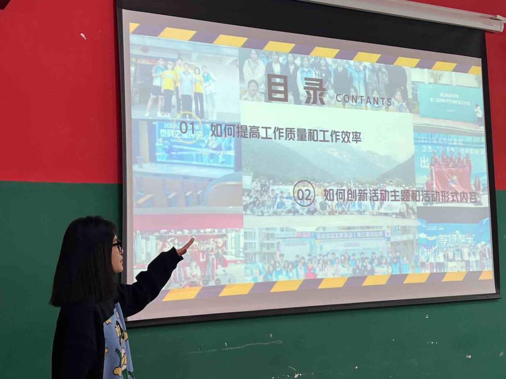 完满活动的完满二字意味着学院活动需具有学院特色,创新多向发展,这也是舒丽颖学姐在工作中坚持的信念。如何创新,如何举办具有特色又切合主题的活动是现阶段干事们的难题。对此,舒学姐从如何提高工作质量和工作效率以及如何创新活动主题和活动形式内容两方面进行了经验分享。着重强调了制定工作计划、集中精力的重要性,给大家分享了创新工作的“头脑风暴法”,并表达了殷切期望。相信干事们会吸取经验,成就更好的自己。