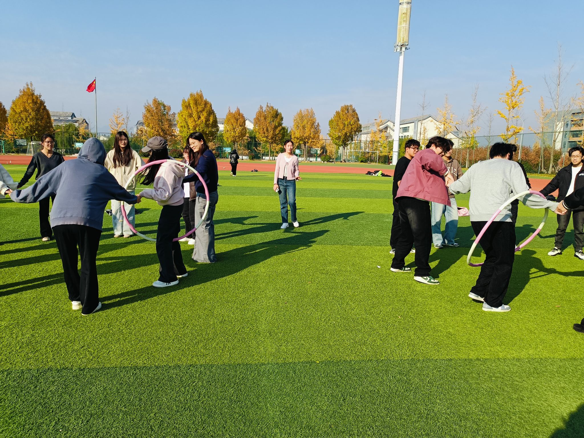 紧接着的一圈到底环节考验着团队的协作与应变能力。各队成员手拉手围成圆圈,需在不松手的情况下将呼啦圈从首位成员传递至末位成员。起初部分队伍节奏混乱,经过短暂沟通后,大家迅速找到技巧,通过身体的灵活转动与位置调整,让呼啦圈顺畅传递。第四队凭借高效的配合与快速的反应,以最短时间完成挑战,赢得现场阵阵喝彩。