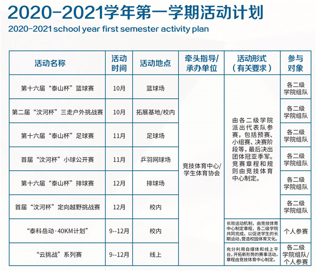 信息发布会第二项,由竞技体育中心任家兴老师进行本学期体育赛事活动简介。本学期竞技体育中心依据“12235+”赛事活动体系,每月各编排一项“泰山杯”和“汶河杯”赛事,并全程开展我校特色长效运动机制。同时,竞技体育中心根据以往赛事经验,聚焦问题,精准发力,从“报名筹备”、“参赛事宜”、“处罚办法”三个方面,总结出若干体育赛事参赛规则、要求、纪律,并与各参会代表进行沟通。