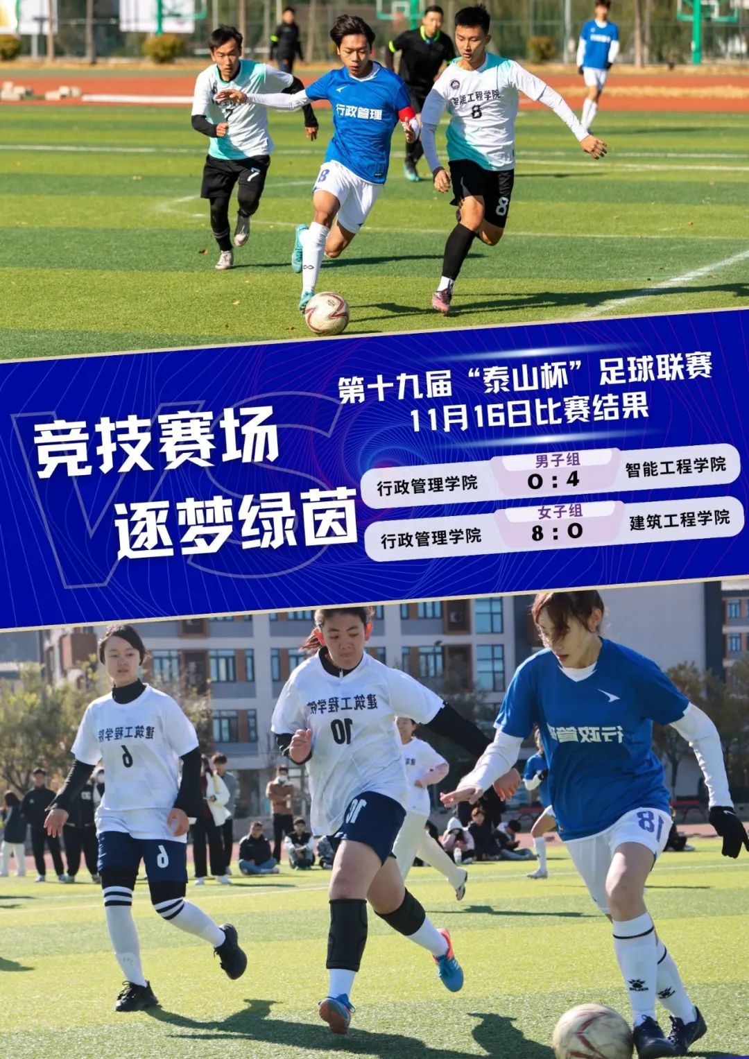 11月16日,我校第十九届“泰山杯”足球联赛正式启动。本次联赛设置男子七人制和女子五人制两大组别,168名运动员将在13个比赛日里,完成32场次的绿茵竞技。