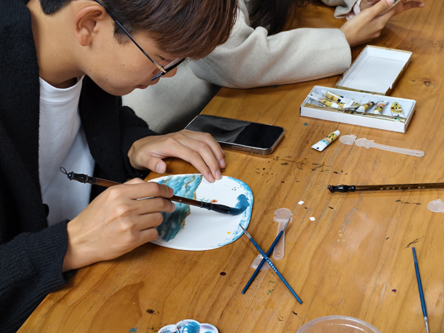同学们以铅笔为起点,勾勒出事物的初步轮廓;再用毛笔轻蘸色彩,为画面注入鲜活的生命力;最后以勾线笔精心刻画细节,每一笔都倾注着他们对美的独特理解与追求。在创作的过程中,同学们的热情如同熊熊燃烧的火焰,他们热烈地交流作品,分享创作心得,共同沉浸于绘画带来的喜悦与成就感之中,尽情享受艺术世界给予的滋养与启迪。同学们将空白的扇子变成自己对壁画的理解,这是最有成就感的一刻。