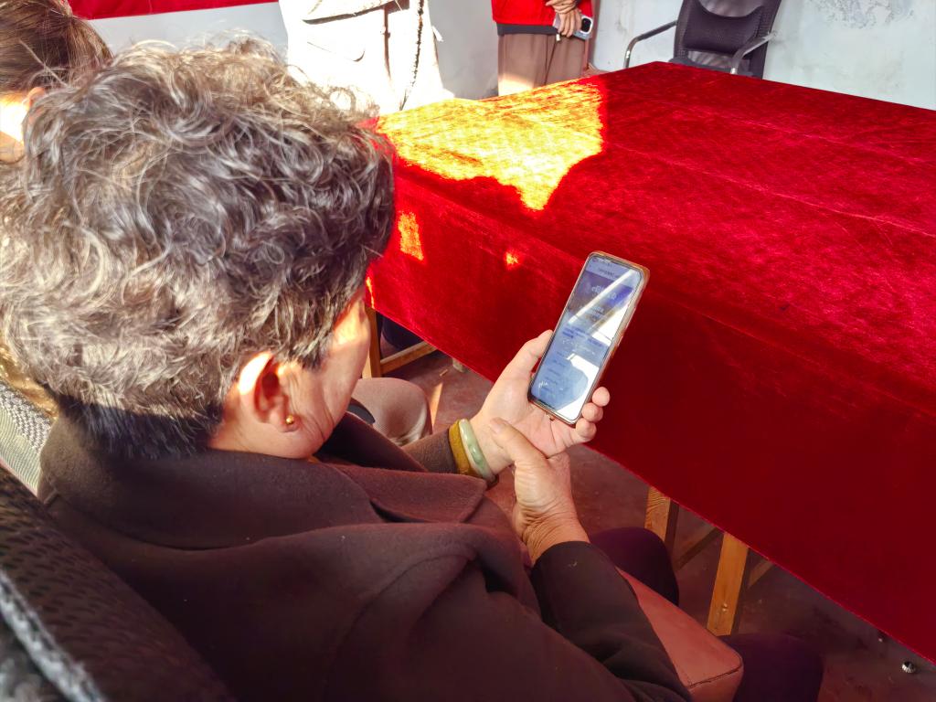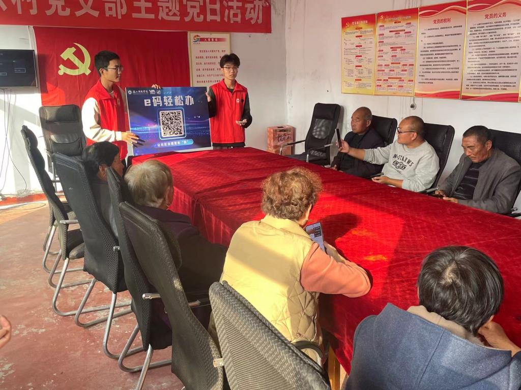 接着由张桠闻同学讲解“e码轻松办”的功能和使用方法,详细解释了如何通过扫描二维码,快速访问到各种实用的服务模块,比如查询信息、提交申请或是寻求帮助等。张桠闻同学还举了一些具体的例子,现场演示了“e码轻松办”的使用流程,展示了如何查询信息、提交表单等步骤,现场气氛热烈。村民们纷纷拿出自己的手机进行扫码,由各位志愿者帮忙解答小程序上的问题,让村民们更加简单易懂的了解该项目,一位村民感慨道:“这些志愿者们为我们带来如此多实用的服务。这个二维码真是方便,以后有问题便能随时向他们求助。”