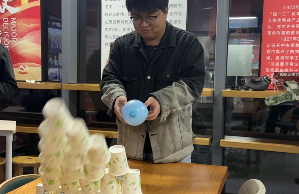 参赛者需先吹起气球,再利用气球的气体来吹动纸杯,比拼谁先将所有纸杯吹掉倒。此游戏既考验肺活量,也考验个人技巧和策略。尽管有些同学气球吹的很大,却未必能够成功吹倒纸杯。然而,通过这个游戏,他们不仅锻炼了肺活量,还积累了宝贵的经验。