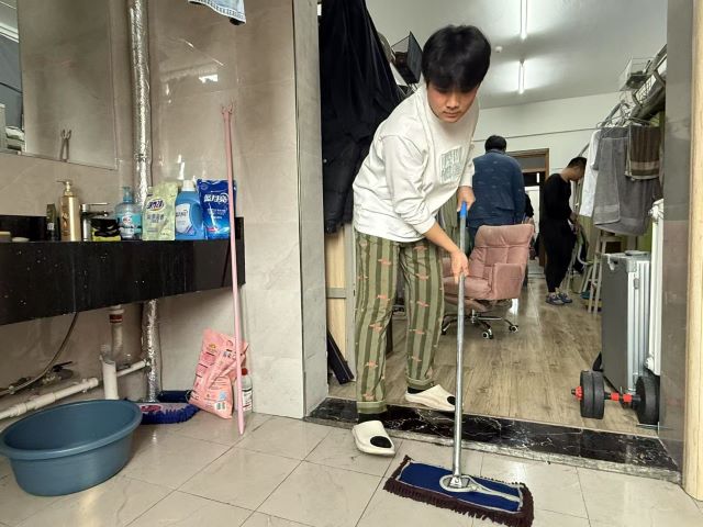 随着主持人宣布宿舍清扫环节正式开始,同学们如同离弦之箭,迅速朝着自己的宿舍进发。各参赛小组依照提前安排好的宿舍分配,在工作人员处有序领取清洁工具。领到工具后,大家迫不及待地冲进各自的宿舍,瞬间,宿舍内便充满了忙碌的身影与劳动的热情。有的同学手持扫帚,认真清扫地面的每一个角落,不放过任何一片纸屑与灰尘;有的同学则拿着抹布,细致地擦拭着桌椅、窗台,将每一处都擦得锃亮;还有的同学负责整理物品,将杂乱的书籍、衣物分类归置,使宿舍瞬间变得井井有条。