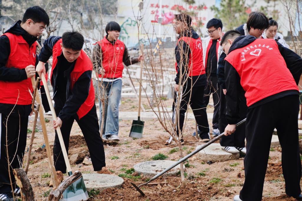 清晨,志愿团队来到泰山脚下美丽的白马石村,白马石村党支部宣传委员、团委书记史洪波书记为志愿者细心科普了关于种植的知识。“咱村石榴文化有悠久的历史,今天种下的就是环山路旁的新希望!”史书记边示范边科普。随后,身穿红马甲的志愿者们三人一组,明确分工,拿起铁锹楔入土地,清理石块,搬运树苗,填入树坑,提水浇灌,为这片土地种下“村宠”——石榴树苗。很快,五十余个深浅不一的树坑在三月阳光里呼吸,石榴树苗在春风中轻轻摇曳,这些来自泰山脚下的根系,正在白马石村岩层的褶皱里寻找共生的可能,那些缠绕在春风里的碳链,原来是有形状的浇灌。