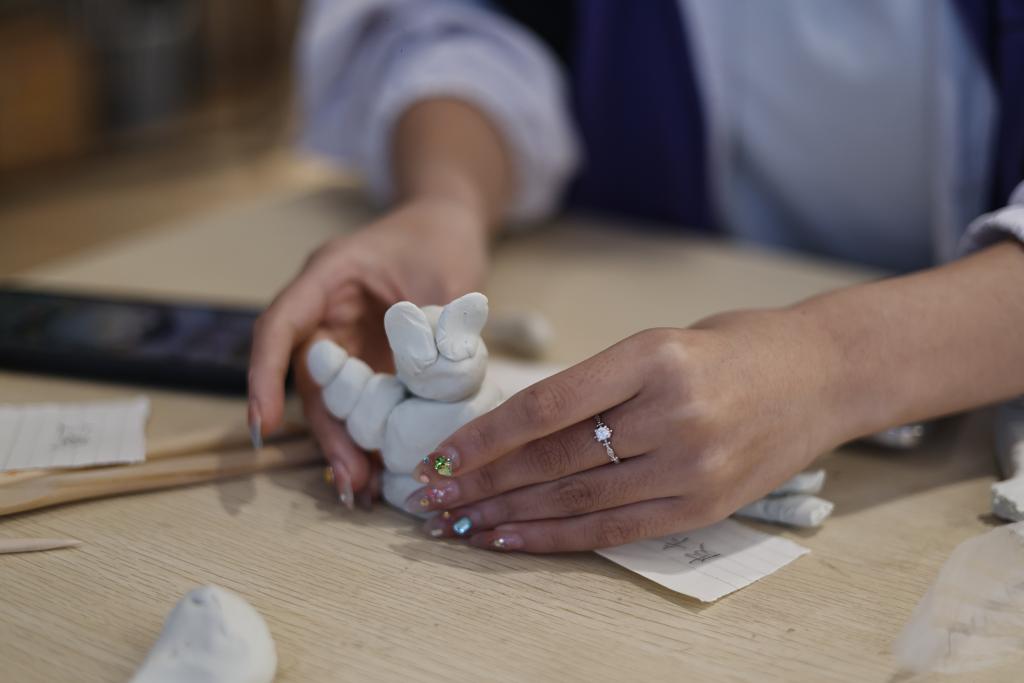 教学环节秒变武林大会,班长张倚杭举着"兵器谱"穿梭指导:用棉签给Hello Kitty滚出毛绒质感,用画笔按压出熊猫的渐变黑眼圈,更传授独门秘籍——用画铲铲平油泥雕塑上坑坑洼洼之处。突然,后排传来哀嚎:"库洛米的头骨裂了!"只见团支书吴凯化身"油泥外科医生",用牙签支架进行内部加固,还顺势雕出哥特风裂纹:"现在它是战损限定款!"
