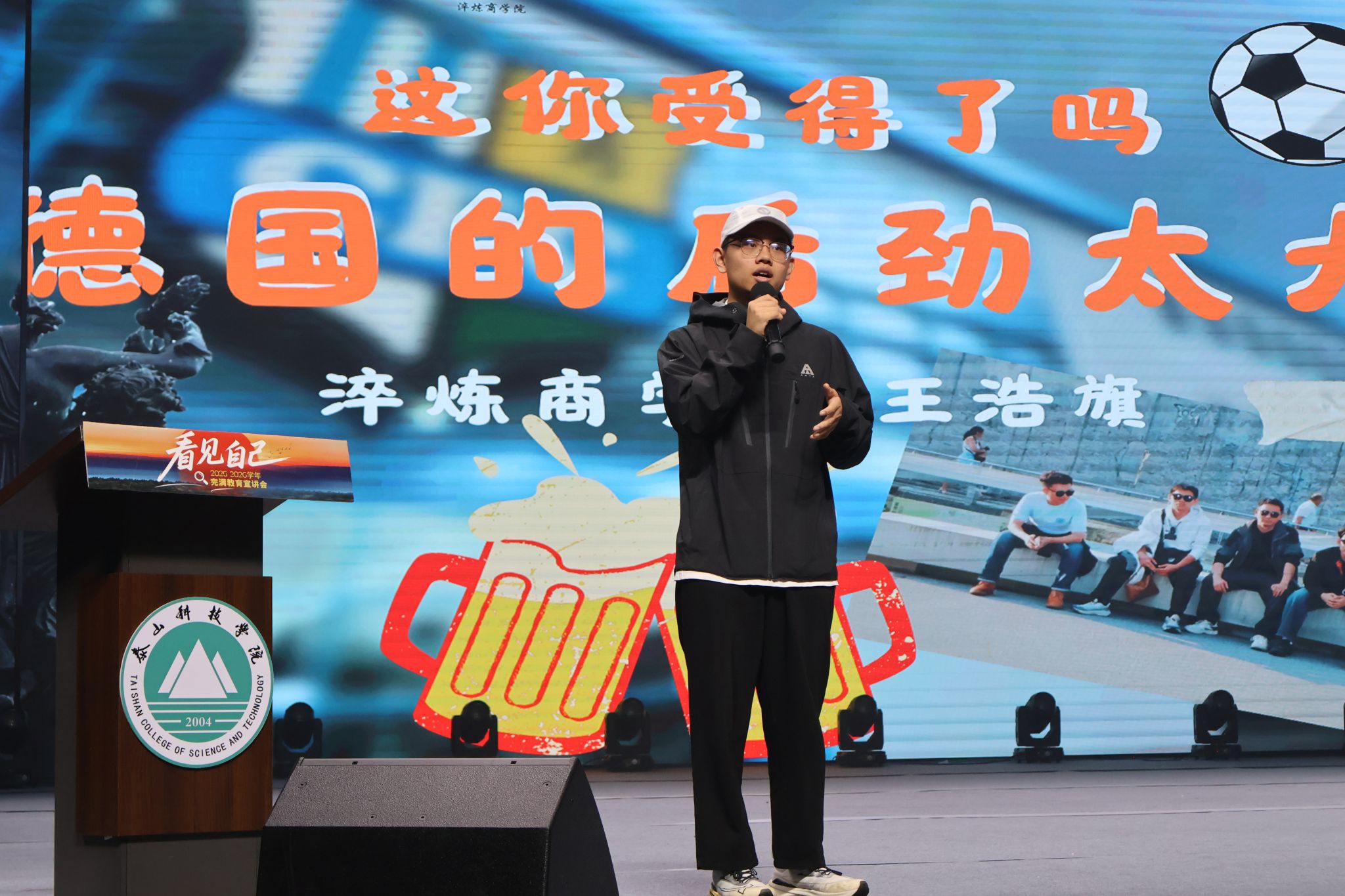 王浩旗同学以“这你受得了吗,在德国的后劲太大了”为主题进行了分享,首先王浩旗同学向同学们对比了学校研学相较于跟团游的巨大优势和收获,爱好摄影的浩旗同学向现场同学展示了从开姆尼茨动物园到乐队演出、周末球赛,从莱比锡与柏林再到捷克,从美食到人文的摄影作品,以及自己在这过程中的一次次震撼,最后王浩旗同学以“人生不过三万天,开心一天是一天”鼓励同学们把握学校提供的宝贵的研学机会。