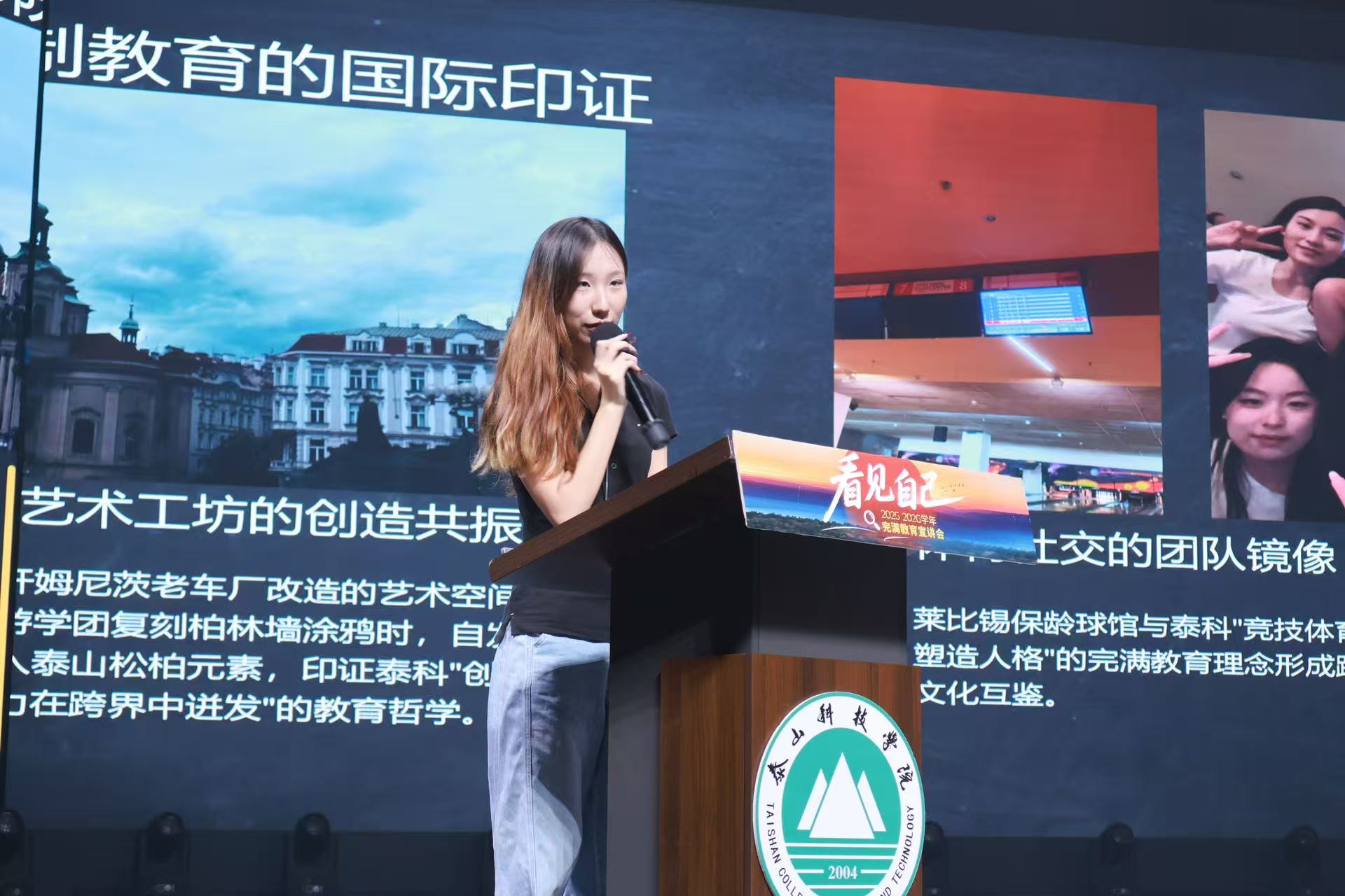 刘海凝同学从课堂学习、外出体验、文化碰撞、成长印记四个篇章做了分享,“刚踏入布拉格老城,我就被这里的建筑深深吸引,哥特式的尖顶、巴洛克式的浮雕,在阳光下闪闪发光”刘海凝同学特别向在场的同学们分享了参观布拉格的震撼感受,当中世纪风情与现在的热闹完美交融,让人沉醉其中。