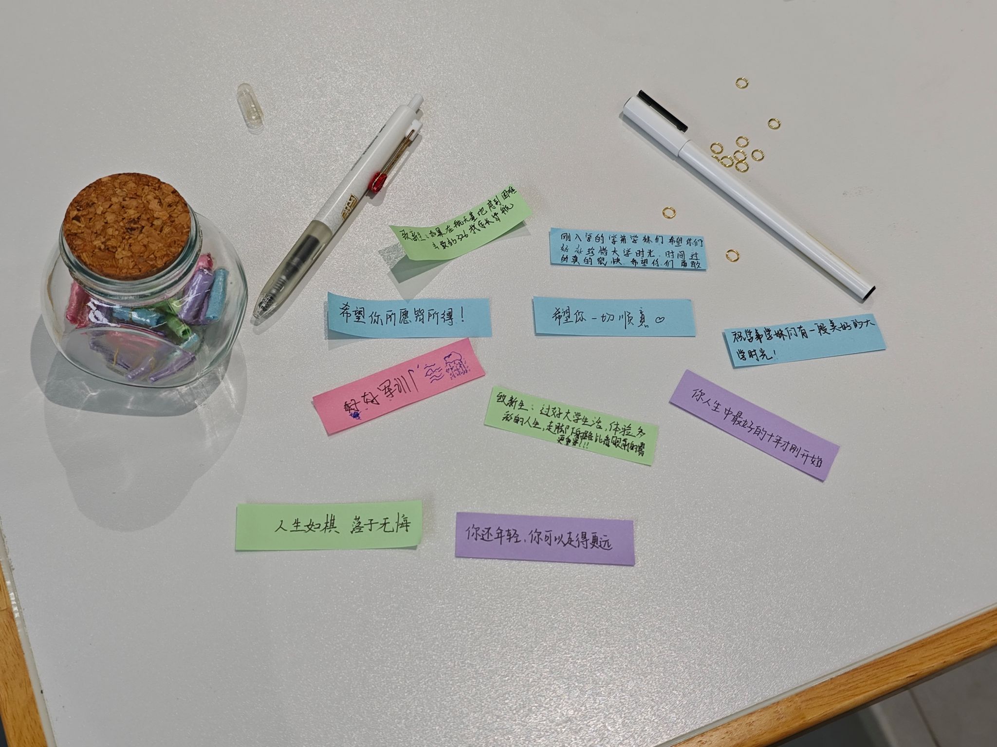 参与者们纷纷响应,再次拿起笔。有人写道“遇到困难时别独自硬扛,学长学姐和老师都是你的后盾”,还有人用俏皮的语气调侃“三食堂一楼的老鸭粉丝汤值得一试,记得早点去”。这些带着温度的文字,没有华丽的辞藻,却满含对新生的善意与关怀。活动结束后,“微光寻迹”志愿服务队的组织者们收集好所有写给新生的寄语,第一时间将这份“跨时空的温暖”送到了新生手中。当新生们拆开便签,读到陌生学长学姐的祝福时,脸上露出了惊喜的笑容——这不仅是一张小小的便签,更是一份跨越陌生的善意,一份属于校园的独家温暖。