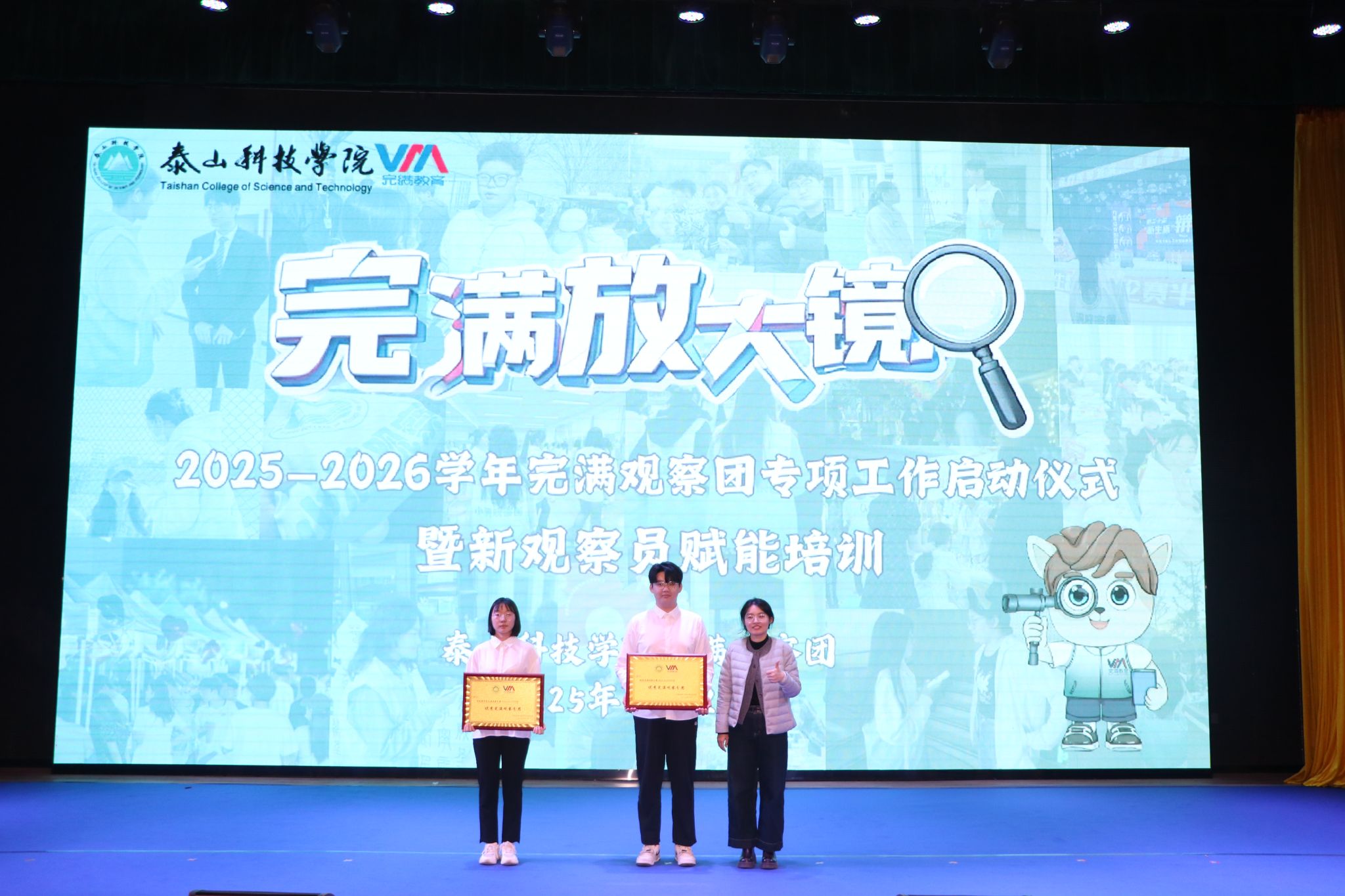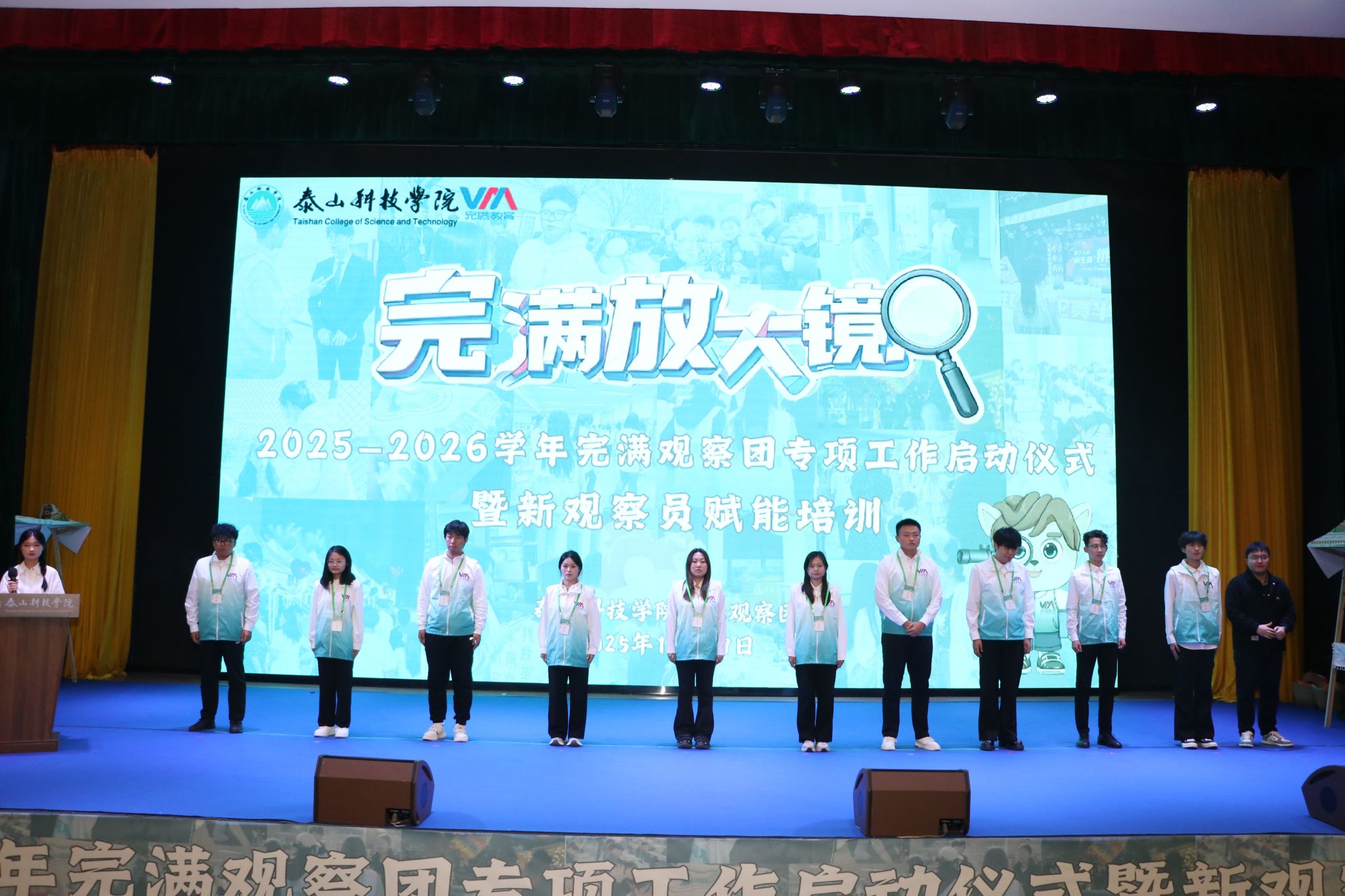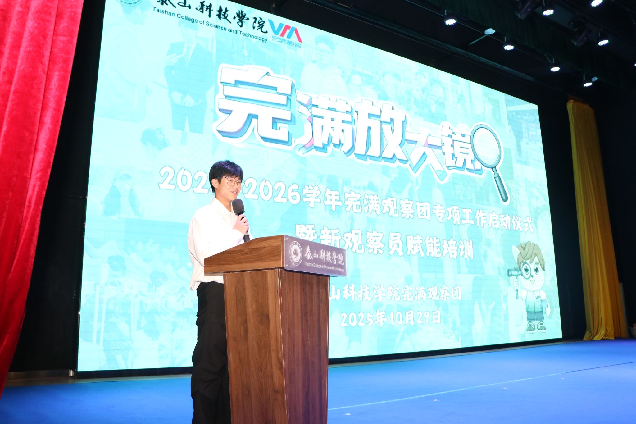 当情景剧的最后一幕结束,现场掌声渐息,活动正式转入启动仪式环节。首先由校级完满观察分团指导老师邱信伟宣读了《关于启动新学年泰山科技学院完满观察团专项工作的通知》,明确了新学年完满观察团“聚焦活动实效、链接学生需求、助力完满升级”的三大核心任务,同时公布了观察团的组织架构与分团职责,为后续工作的有序开展划定了框架。