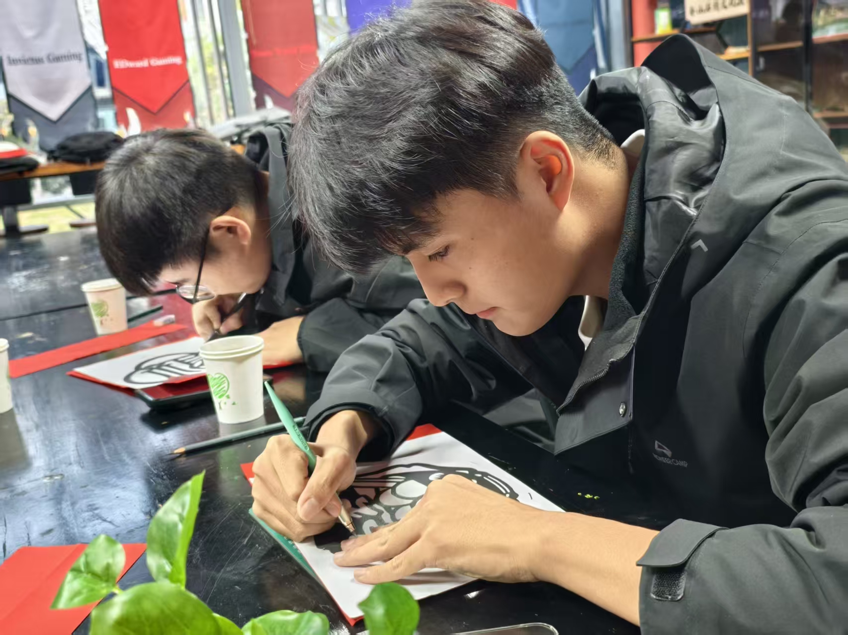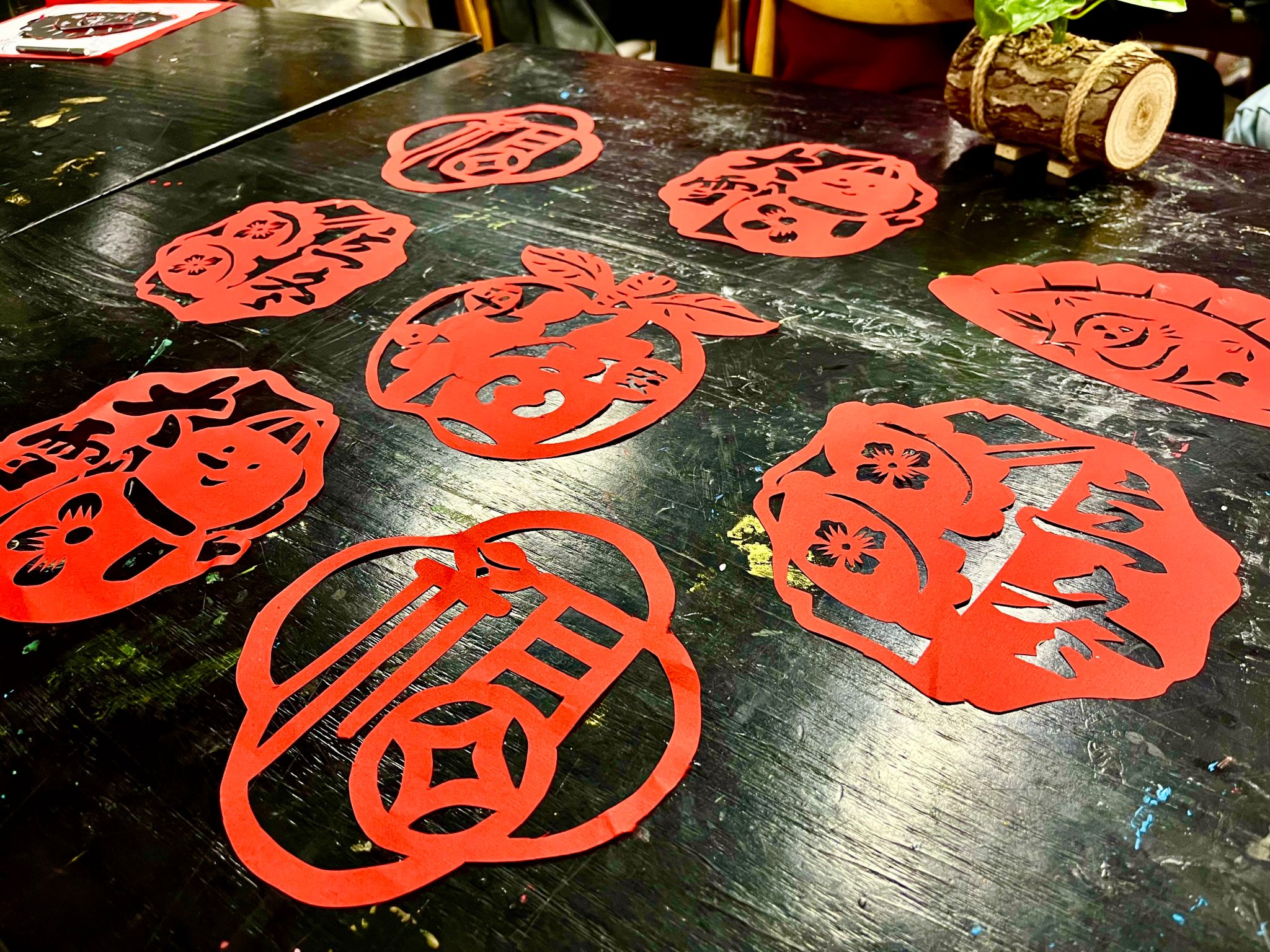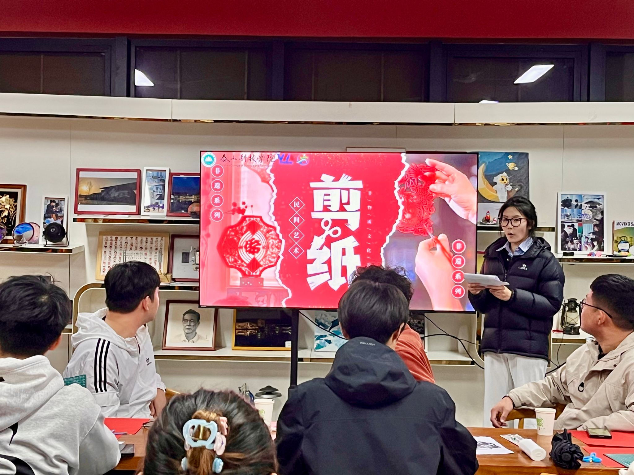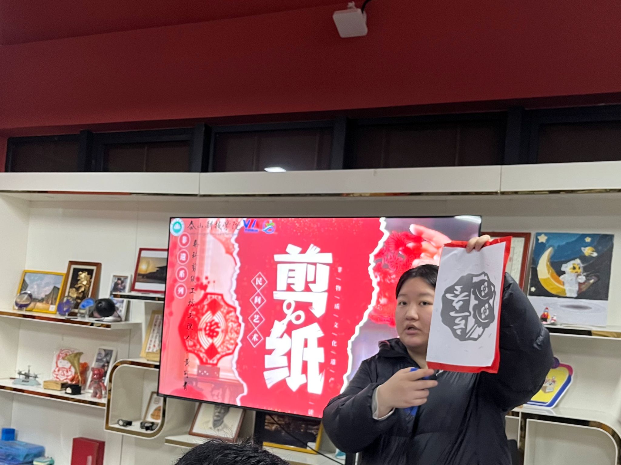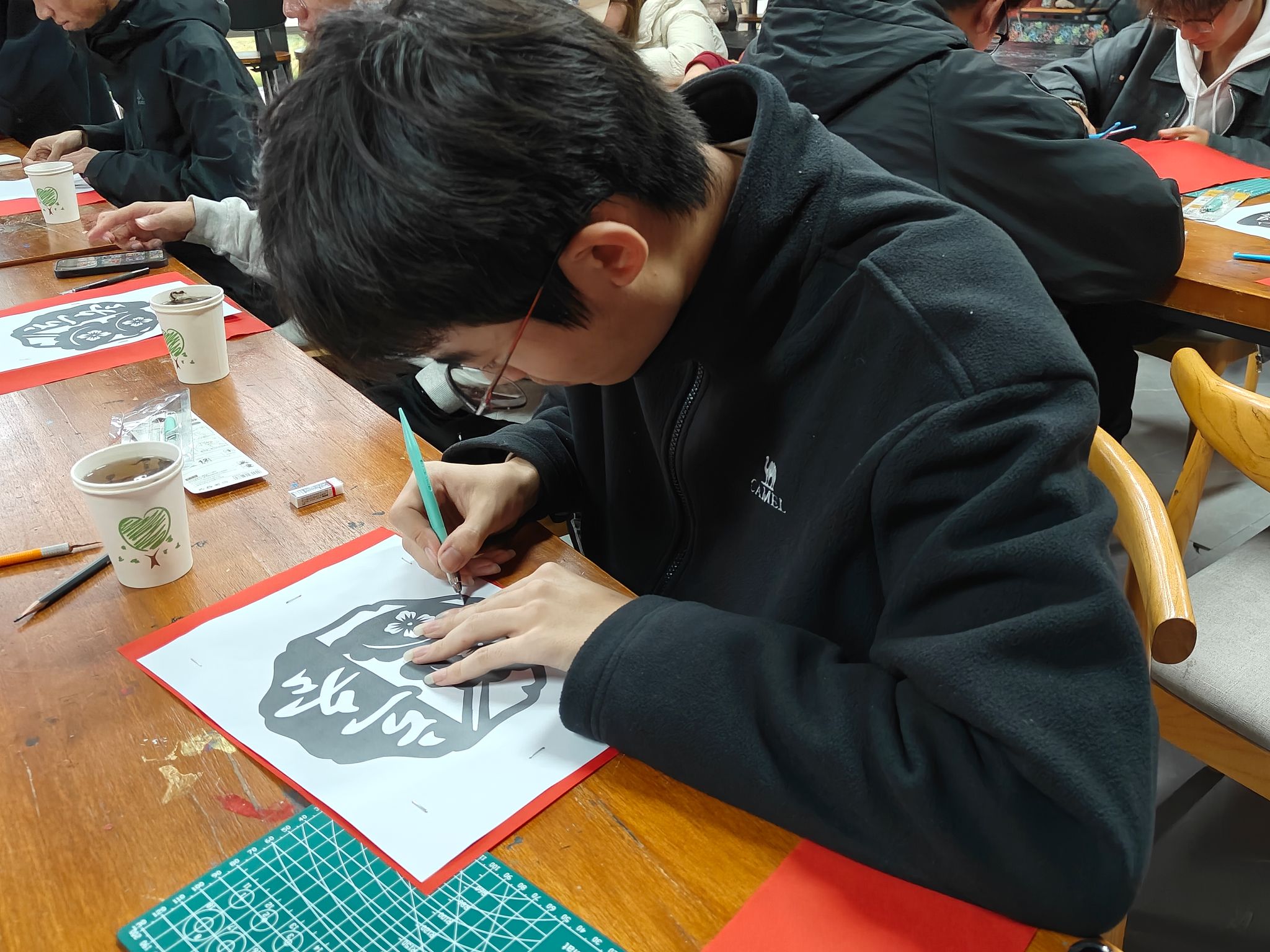 掌声中,泰科剪纸工坊主理人黄可青同学闪亮登场。她从剪纸刻纸的历史讲起,解读每一个图案符号背后的吉祥寓意,并亲自演示折纸、画稿、运刀的技巧。“刻纸讲究‘千刻不断’,线线相连,这不仅是手艺,更是中国人讲究圆满、注重联结的哲学。”她一边手下生花,一边讲述着技艺背后的文化脉络,让同学们在动刀之前,先读懂了剪纸刻纸的“心”。