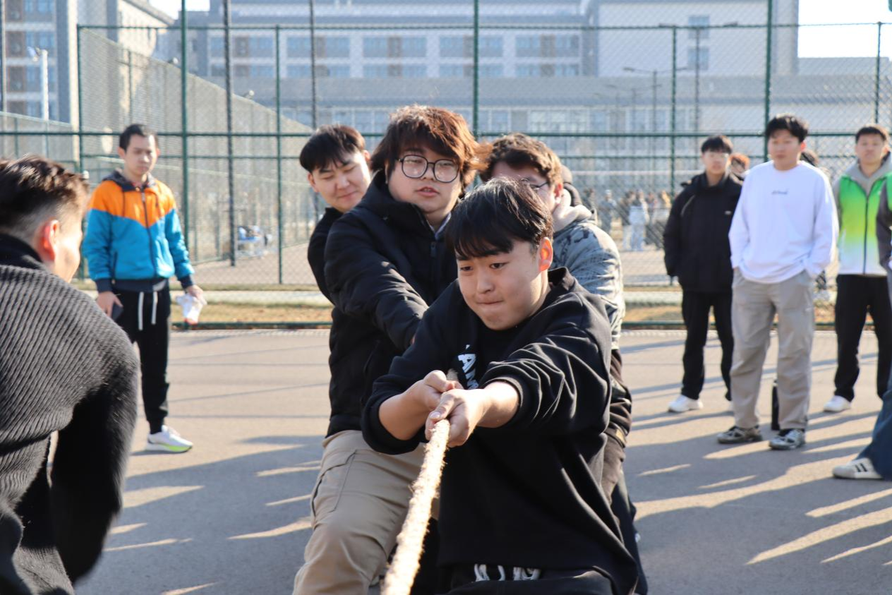 比赛由14位辅导员组成的“示范天团”率先将气氛点燃!一边是四位男老师稳扎马步、力沉绳尾,如定海神针般锚定阵脚;另一边,十位女老师并肩挽臂、齐声发力,以人数与气势织就一道昂扬战线。麻绳在瞬间绷如满弓,红绸在力量与欢笑间来回移动——最终,男老师组凭借体重与力量的默契配合锁定胜局。红绸过线一刻,这场“四两对十金”的精彩较量让全场响起热烈欢呼。同学们发现,平日里沉稳从容的辅导员,在赛场上也会为每一寸绳距拼尽全力、表情生动——他们不仅是传道授业的师长,更是可以并肩作战、真实可爱的伙伴。