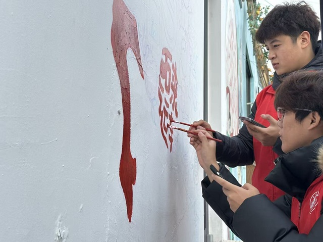 墙绘现场,志愿者们分工明确、默契配合。有人循着电子版图样勾勒清晰轮廓,有人手持颜料专注填充色彩,稳稳的笔触让热烈的红色均匀铺展在墙面上,自然过渡间,朴素的墙面仿佛被唤醒了生命力。红色主调下的专属设计格外醒目,搭配着乡村常见的自然风景与民俗小细节,志愿者们一笔一画细细描摹,原本单调的墙体渐渐“活”了起来,成为村里一道亮眼又接地气的视觉风景线。