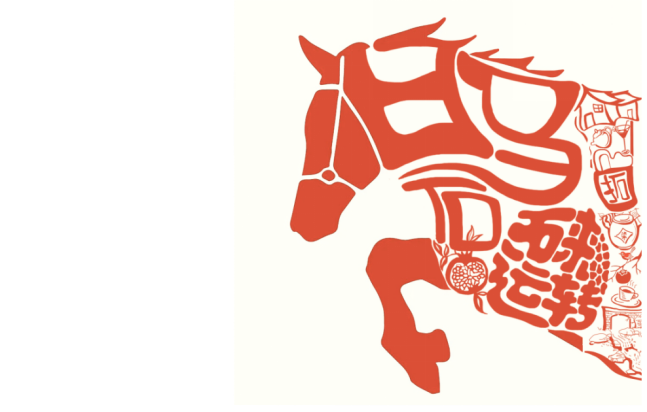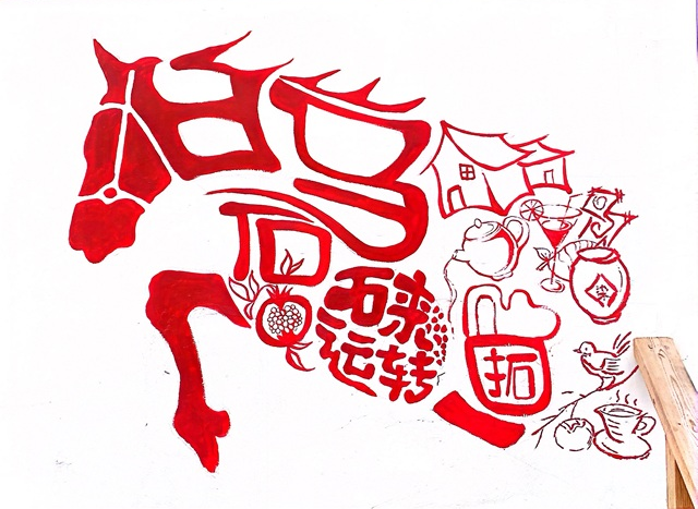 创作前期,志愿者们专门走进白马石村,收集当地特色产业元素,围坐在一起反复商讨。考虑到马年的吉祥寓意,又要贴合村庄“白马石”之名,还得凸显本地特产石榴的特色,最终确定了以灵动“马”形为核心、融入石榴元素的专属设计,既呼应“石来运转”的美好期许,又彰显乡土物产魅力,同时加入拓印工坊相关意象与民俗生活小场景,让设计既有乡村质朴感,又不失视觉吸引力。