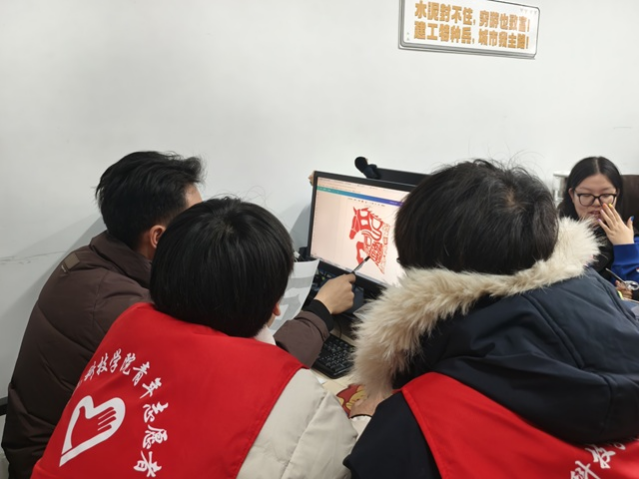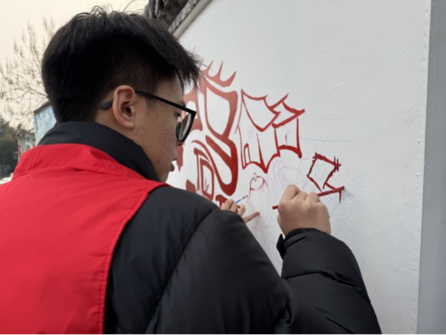 确定方案后,在指导老师的带领下,志愿者们迅速行动,先用制图软件反复打磨细节,精准绘出电子版设计图,最终敲定以中国红为主色调的配色方案,为后续上墙创作筑牢基础。