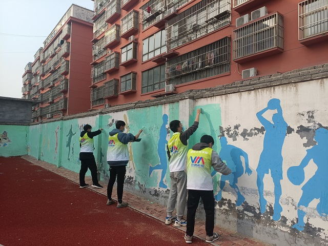 活动伊始,志愿者们对墙绘主题及元素进行了讨论,明确各自的分工,确保活动有序、高效的进行。大家领取了工具和颜料,纷纷开始调配亮丽的色彩,前往分配好的区域进行专心地涂鸦创作,有的负责构图,用单色笔在墙体上勾勒出清晰轮廊;有的负责调色,绿的黄的白的黑的颜料在灵巧的双手间生成七彩斑斓的、符合画面的颜色;有的负责涂色,拿起各式画笔在墙体上细致涂刷。