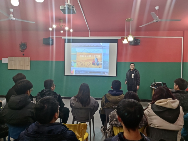 凝聚青春力量,助力美丽乡村。文化墙可以将自然生态、风土人情、乡村特色等融入乡村文明环境建设中,全面打造具有独特魅力的文化新村。为此,建筑工程学院、艺术传媒学院青年志愿者协会于2021年12月3日19时前往瞻岩书院青春乌托邦举办“乡村文化墙”墙绘分享交流会,意在为同学们讲述墙绘志愿服务必备的知识,通过分享以往活动的美好经历和墙绘初体验,为今后开展墙绘志愿服务做好准备。此次活动主要采用宣讲加绘画形式,为同学们开展了一场别开生面的墙绘分享会。