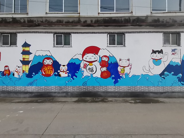 活动过程中,同学们大胆利用自己的兴趣特长为美丽乡村建设贡献一份力。在志愿者团队忙碌而有序的绘制墙面过程中,村民王先生走进志愿队伍当中,不断夸奖同学们画的有多漂亮,为乡村带来了独特而绚丽的风景线。王先生表示年轻时候的自己也爱好画画与艺术,同学们的到来让他看到了年轻时的自己,王先生声称同学们的特色墙绘完成了自己的艺术梦想。志愿者们欣然邀请他加入。正是因为这位叔叔的加入,此次志愿服务的意义也得到升华。墙面绘制临近尾声,伴随夕阳西下,通过五组志愿者的不懈努力与团结协作,三面精美画作跃然墙上,从远处望去,一幅幅艺术插画风格墙绘映入眼帘,墙绘上的海鸥与蓝天融为一体,骑自行车的小女孩仿佛在向梦想进发,而村口的招财猫像是随时准备为村子带来好运。这一切使得原本朴实无华的村落变得绚丽而浪漫。