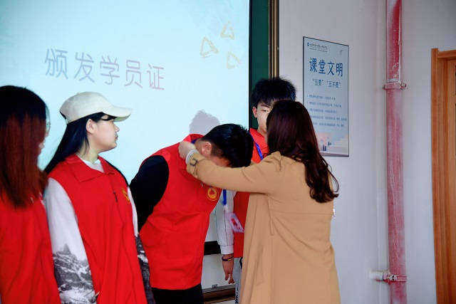 仪式伊始,由吴静老师和赵乐老师为学员佩戴工作证,一张张学员证,印下了大家和志愿的约定,是我校志愿骨干能力朝着专业化发展的入门牌,也是将30位学员凝聚在一起的标志。